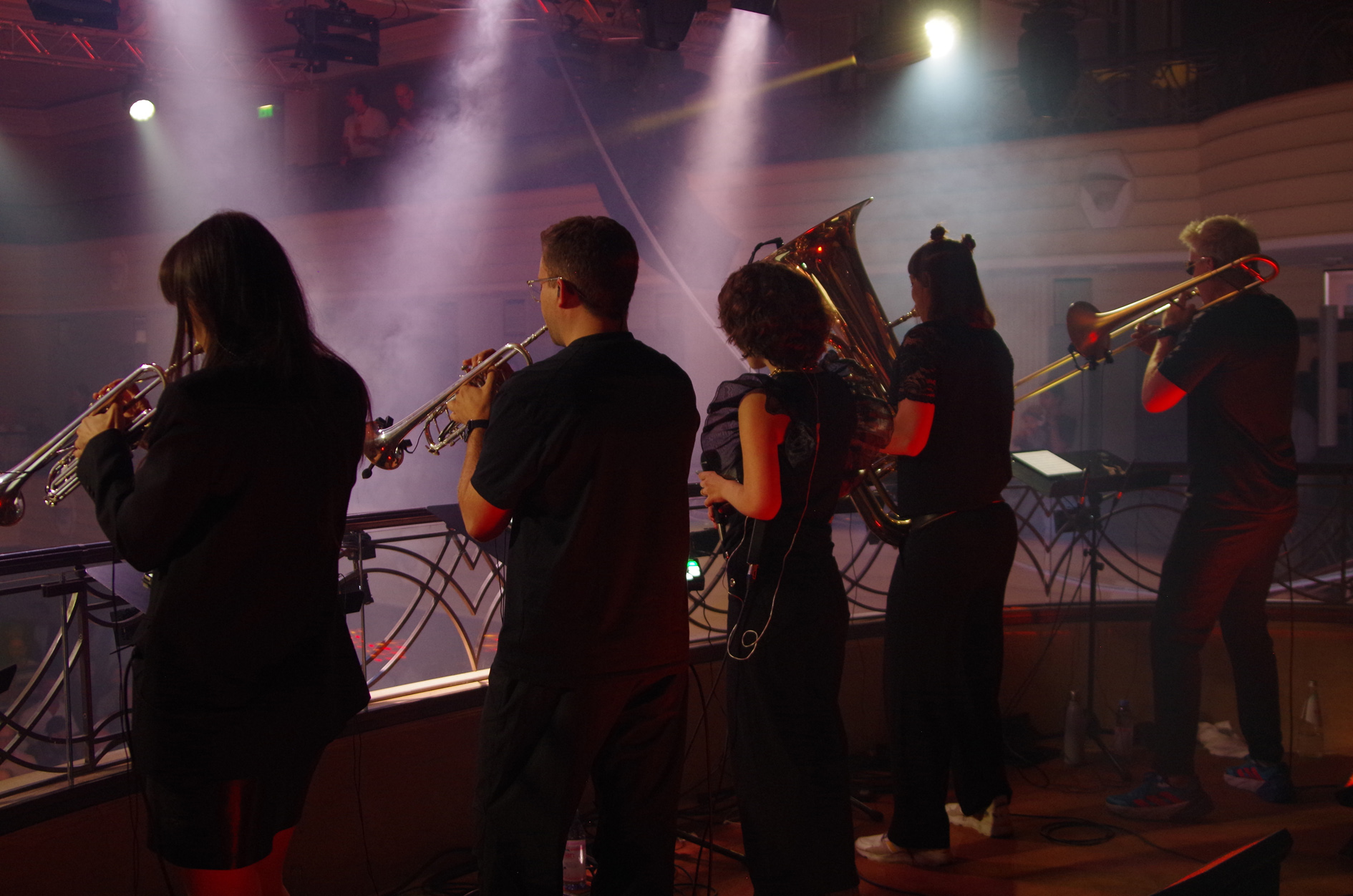 Und noch ein Drummer muss genannt werden: Valentin Renner in der in München heimischen Jazzrausch-Bigband. Die durfte das offizielle Eröffnungskonzert im großen, kunstnebelverhangenen Festsaal spielen. Mit ihrem Techno-Jazz leistet sie programmgemäß ja durchaus einen sehr eigenständigen Beitrag zum Jazz in Deutschland und Europa. Zudem bekam sie eigens einen Kompositionsauftrag, der in einer einstündigen Uraufführung des Programms „Europa“ mündete. Darin verarbeitete Band-Komponist Leonhard Kuhn verschiedene persönliche Eindrücke, wie zum Beispiel die komplizierte Reise von München nach Prag mit der Bahn. Nach der Pause ging es dann härter zur Sache, mit Perlen aus dem umfangreichen Band-Repertoire aus der Feder Kuhns, etwa einer Hymne für die verlorene Heimat im Techno-Club Harry Klein oder dem letzten Satz aus Mahlers 5. Sinfonie, die am 15. September in der Isarphilharmonie aufgeführt werden wird. Den Bigband-Fans wurde genauso viel geboten wie den Freunden der Techno-Beats, der Saal tobte.