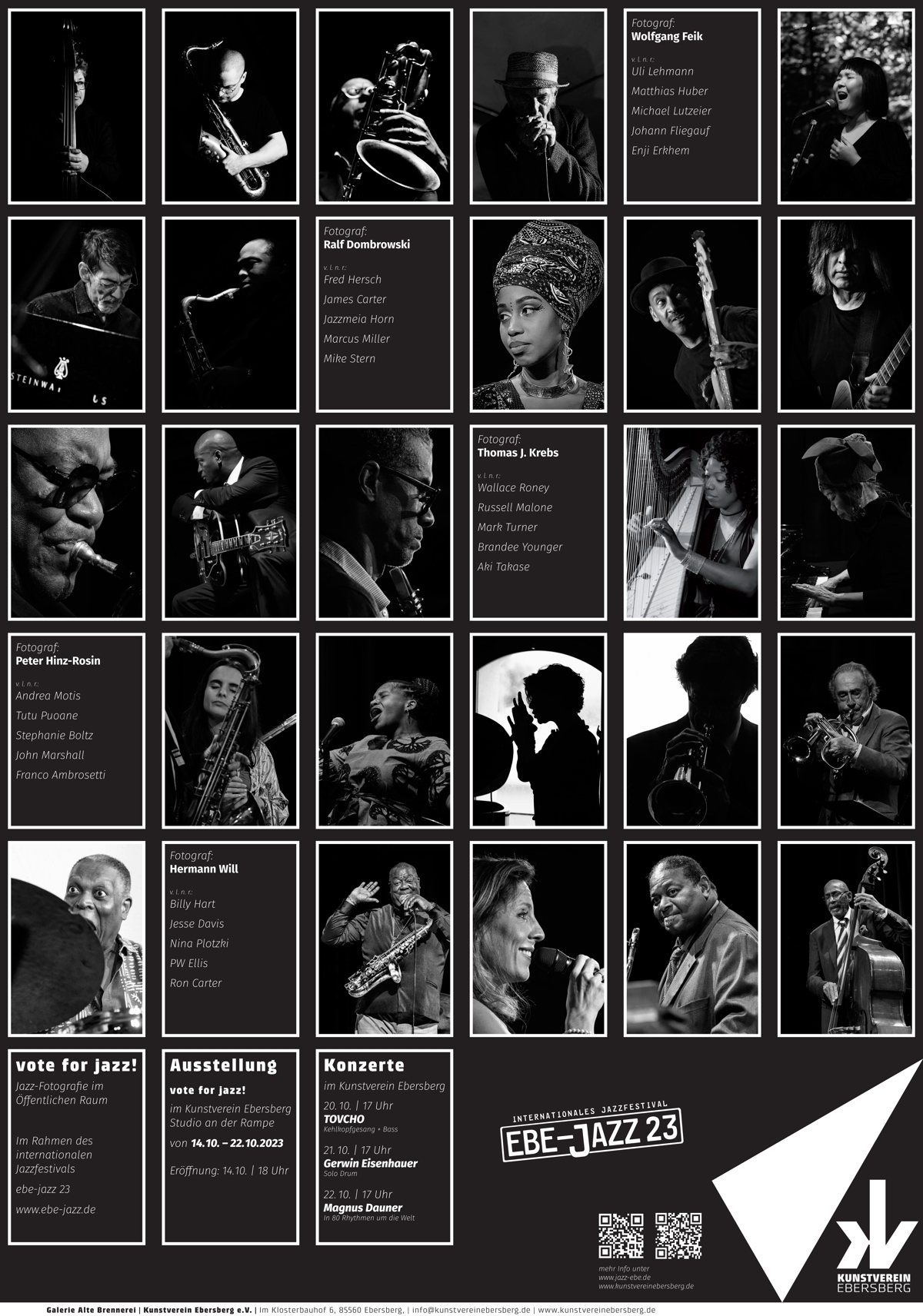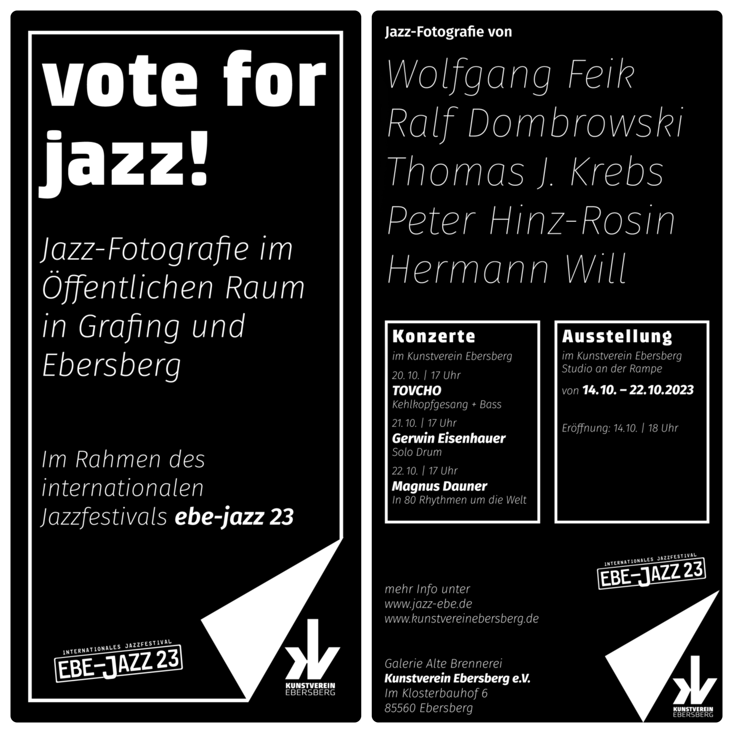 Große Ereignisse werfen ihre Schatten voraus. So auch beim diesjährigen EBE-Jazz 23. Das Eberberger Jazzfestival, das seit 2015 alle zwei Jahre stattfindet, hatte werbetechnisch eine ganz besondere Aktion vorbereitet. Eine Woche vor Beginn, und damit gleich nach der bayerischen Landtagswahl, wurden die Plakatwände der Parteien, offiziell genehmigt, unter dem Motto „Vote For Jazz“ mit Jazzplakaten von fünf Fotografen überklebt. Die wohl beste Werbung für das Festival im öffentlichen Raum. Auf dem Marktplatz in Ebersberg und Grafing, auf den Einfallstraßen, überall klebten die eindrucksvollen Motive. Organisiert vom Kunstverein Ebersberg gab es zusätzlich zur Kunst im öffentlichen Raum parallel zum Festival auch eine Ausstellung in den eigenen Räumen.