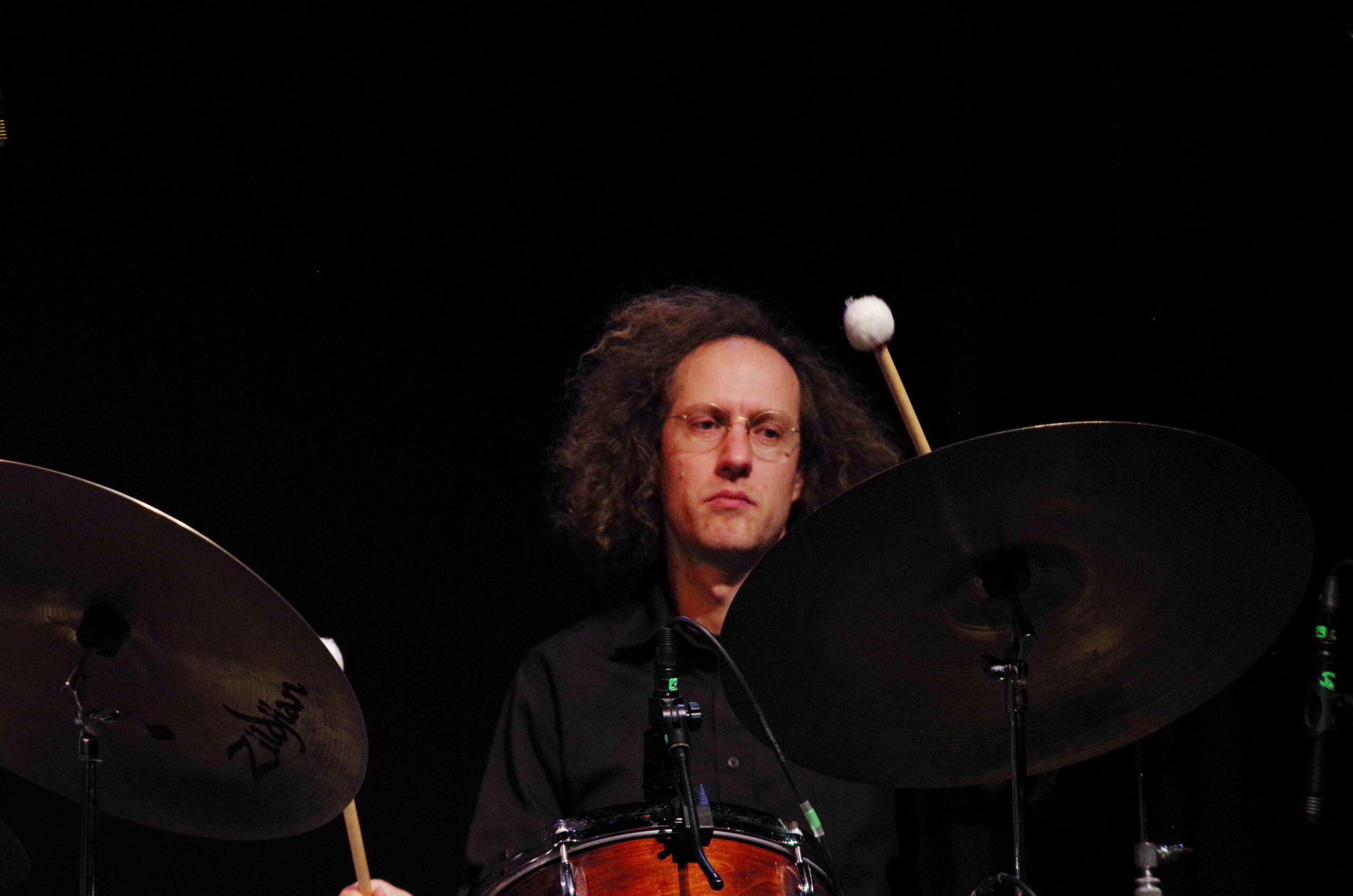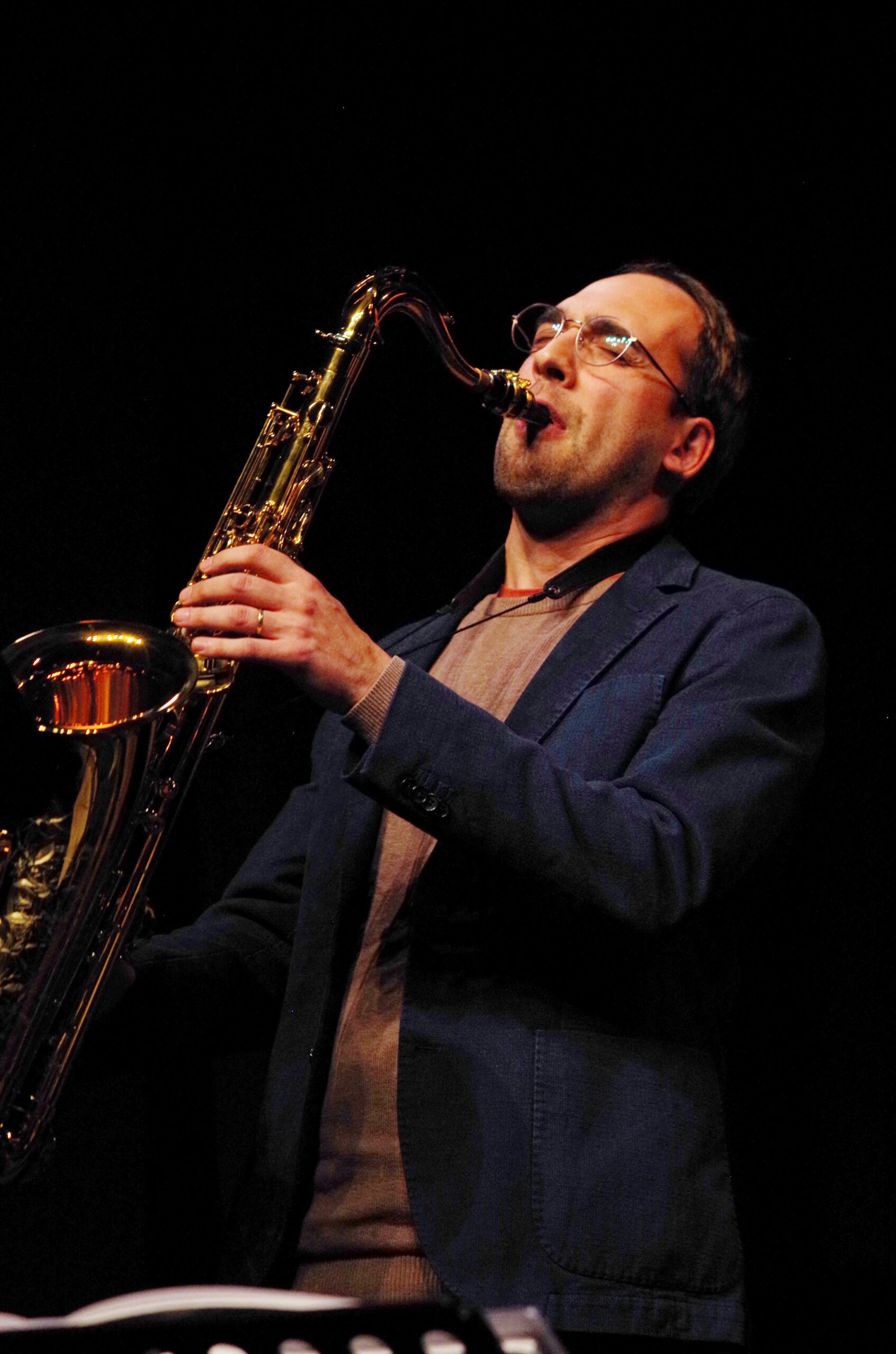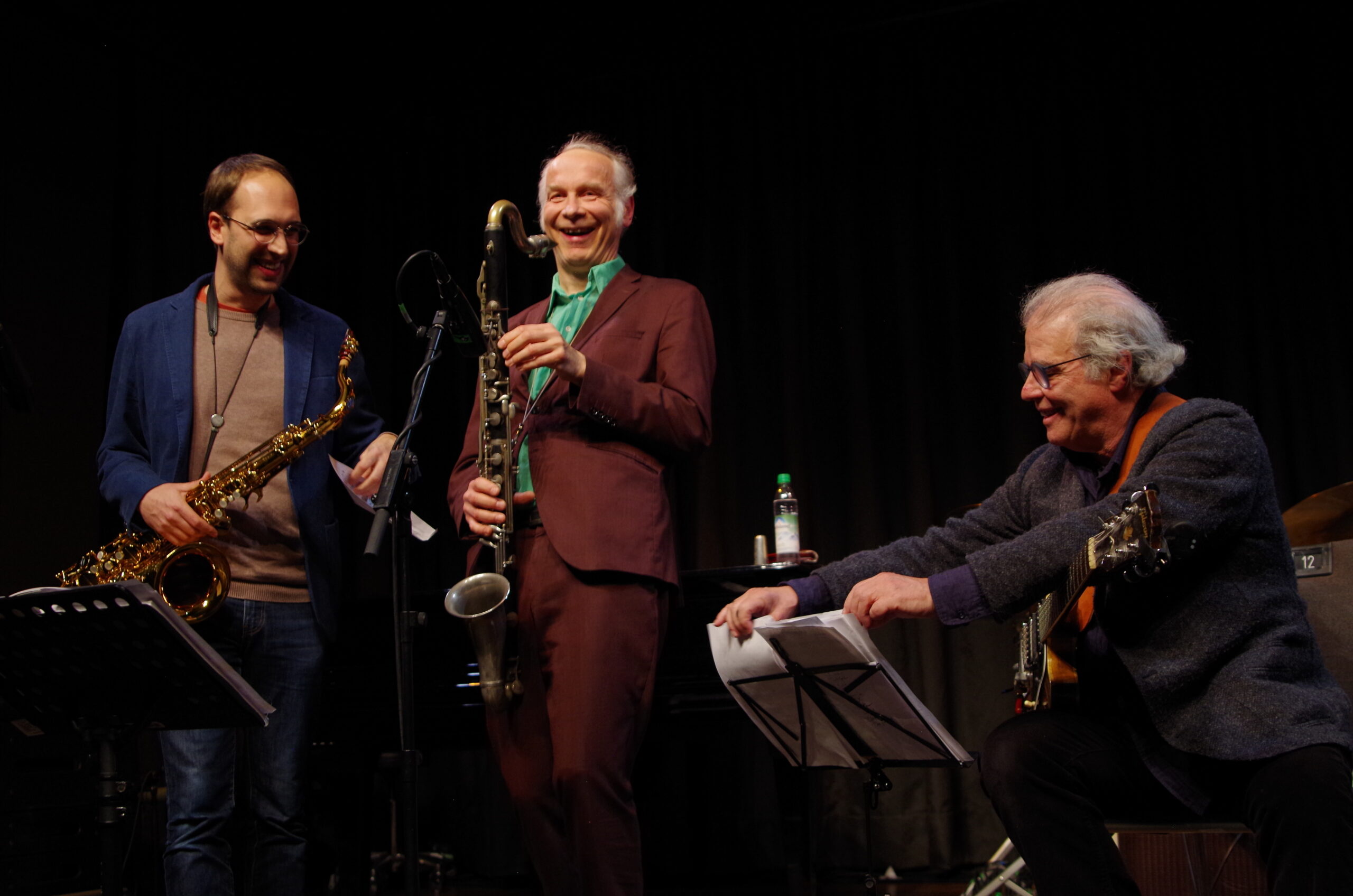„Mostly Monk and a bunch of other stuff“ brachten in der Black Box Geoff Goodman, Matthieu Bordenave und Rudi Mahall zu Gehör. Und trotz des hohen Anspruchs, den die ungewöhnliche Besetzung mit Gitarre, Tenorsaxophon und Bassklarinette mit sich brachte, sorgte das neu formierte Trio nach Mmmmh für einen zweiten Höhepunkt. Einen ebenso virtuosen wie vergnüglichen, wozu auch die Späßchen von Mahall beitrugen, der besonders gut aufgelegt war: „Das nächste Stück kennt ihr alle.“ – „Dann brauchen wir es ja nicht mehr zu spielen.“ – „Haben wir da was ausgemacht? Dann spiele ich es einfach runter. Obwohl das ganz schön schwer ist.“ Schwer hatte es auch das blonde Multitalent Wanja Belaga in seiner Moskauer Kindheit am Konservatorium unter lauter jüdischen Wunderkindern. Auch sonst las er, der jüdisch-russisch-ukrainische Emigrant hintergründig ironische Erinnerungen über die verlorene Heimat Russland. Dazwischen improvisierte er virtuos am Flügel. In seiner Kneipe „Prager Frühling“ gab er einst auch jungen Jazzern eine Bühne. Auch das Tim Collins Trio war neu zu entdecken, obwohl die Musiker aus anderen Bands und miteinander seit langem vertraut sind. Collins am Vibraphon, Matthias Bublath an der elektronischen Orgel und Christian Lettner am Schlagzeug lieferten entspannt, was man von ihnen erwarten konnten: lockeren, beschwingten und melodischen Jazz mit funkigen, bluesigen und afrocubanischen Elementen.