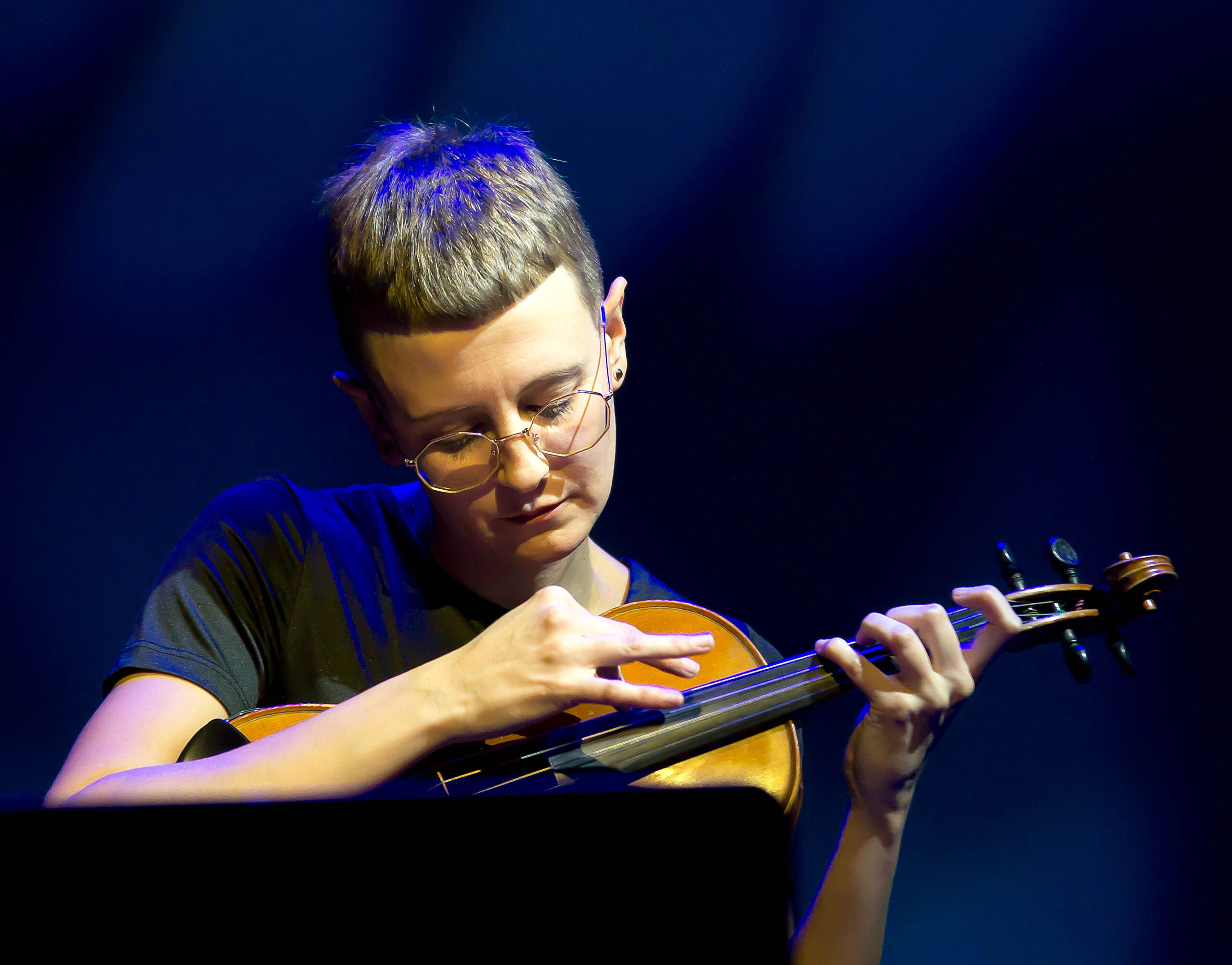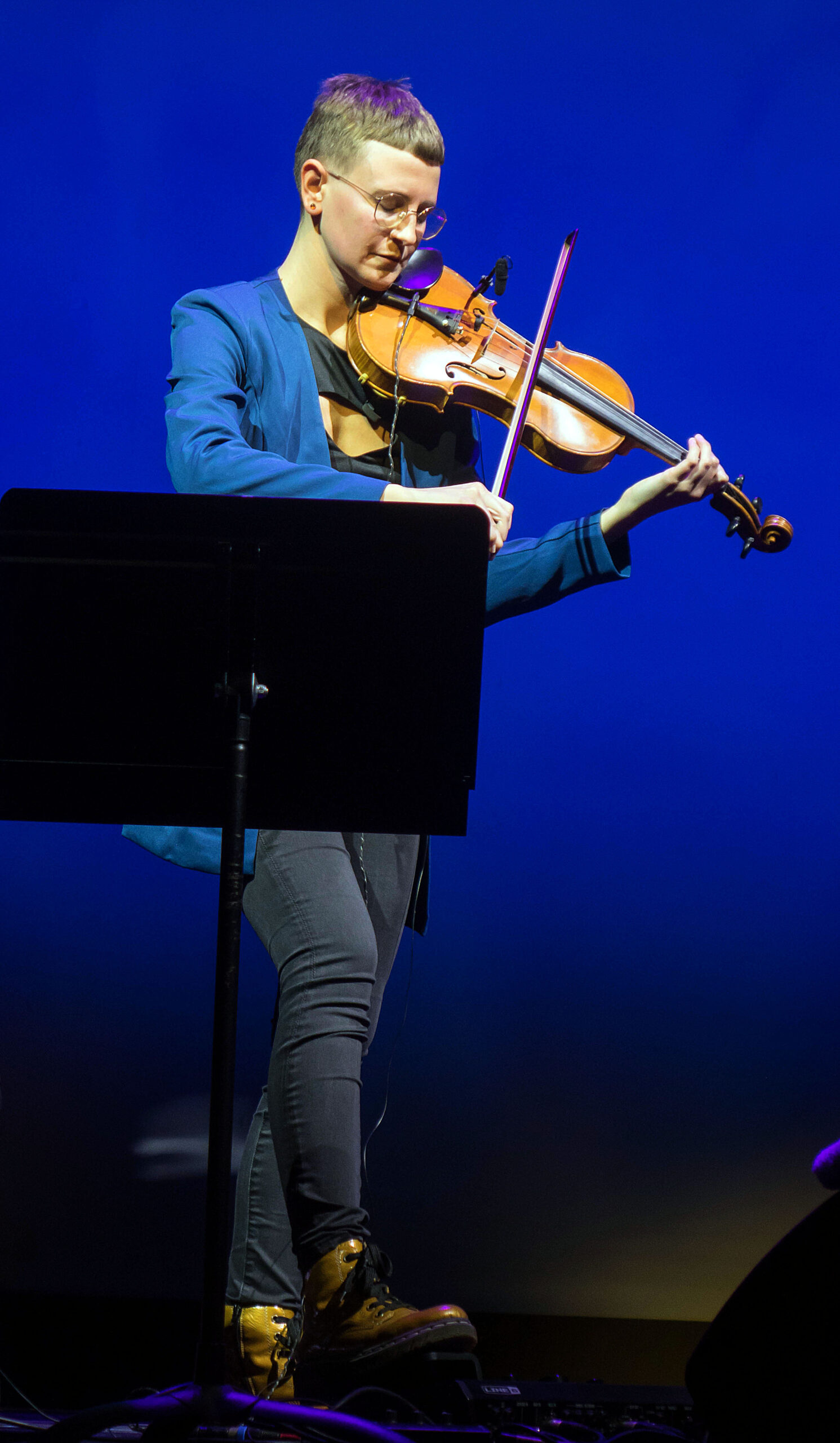 Schmücker kuratiert dieses Festival seit fast 40 Jahren und erneuert es immer wieder auf der Höhe der Zeit. Und das lief direkt zu Beginn der Konzert-Trilogie im Münsteraner Theater auf eine Zelebration maximaler künstlerischer Aufbruchsstimmung hinaus: Die junge italienische Violinistin Anaïs Drago ist „die“ Entdeckung schlechthin! Zusammen mit Federico Calcagno, der Klarinette und Bassklarinette spielt, und Max Trabucco am Schlagzeug und Perkussion entfaltet sich ein innovativer Musizieransatz, der spektakulären Gleichklang zwischen improvisatorischer, virtuoser, neutönerischer und lyrischer Bravour herstellt.