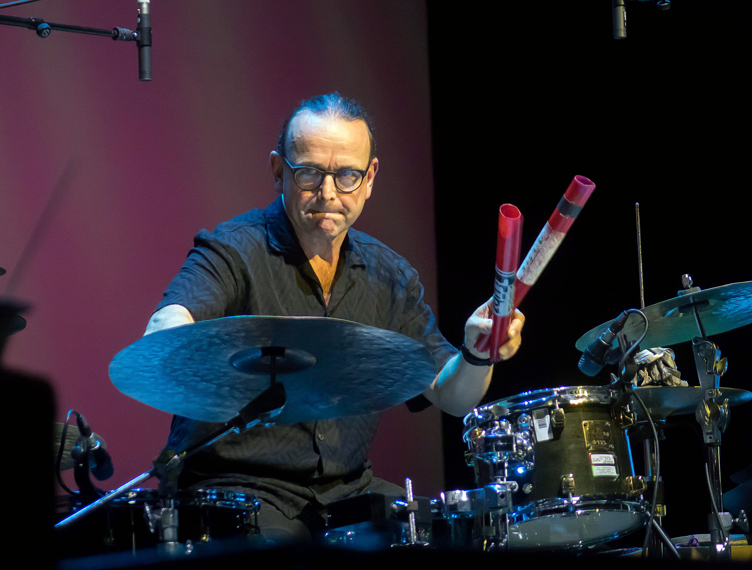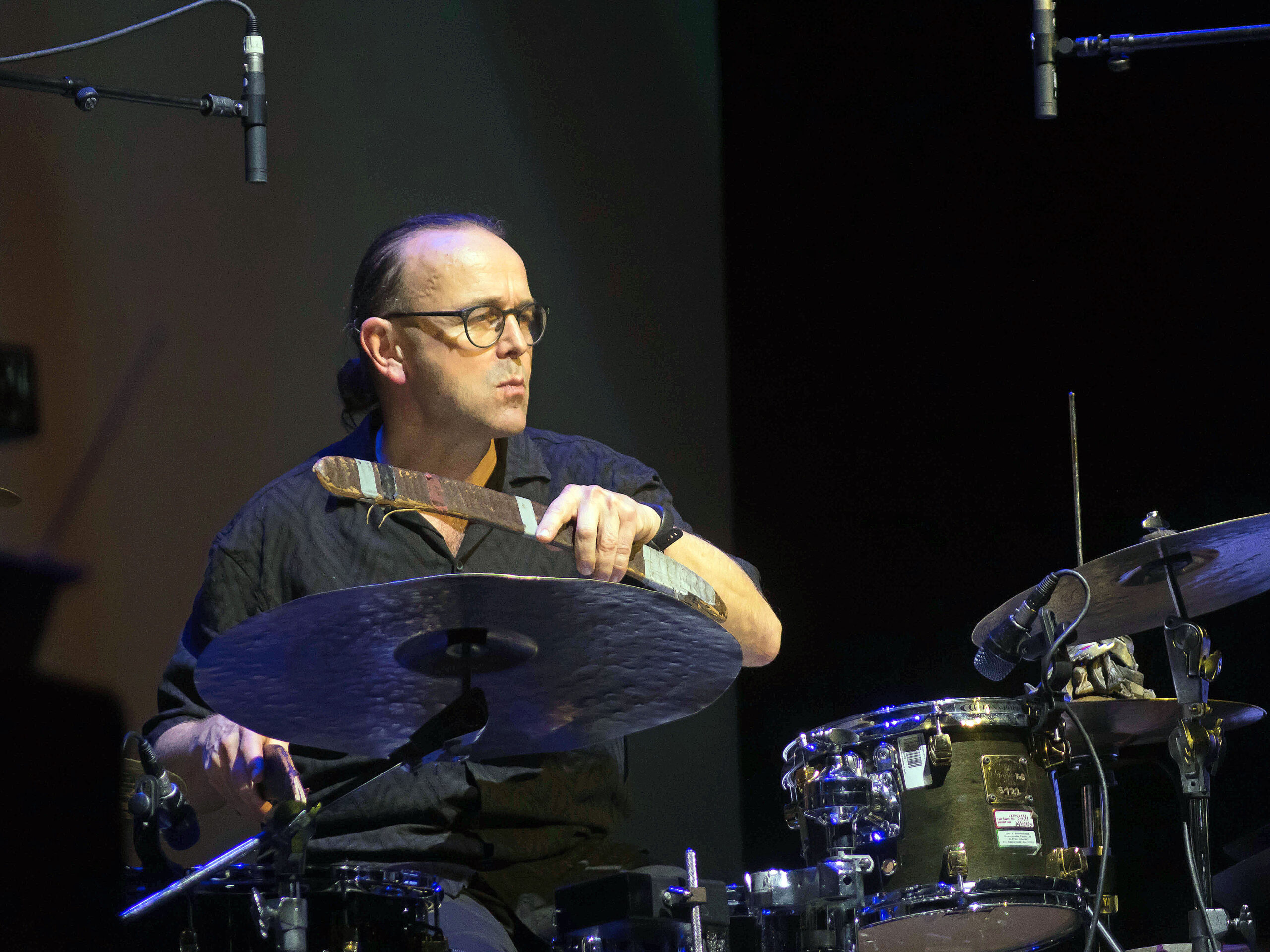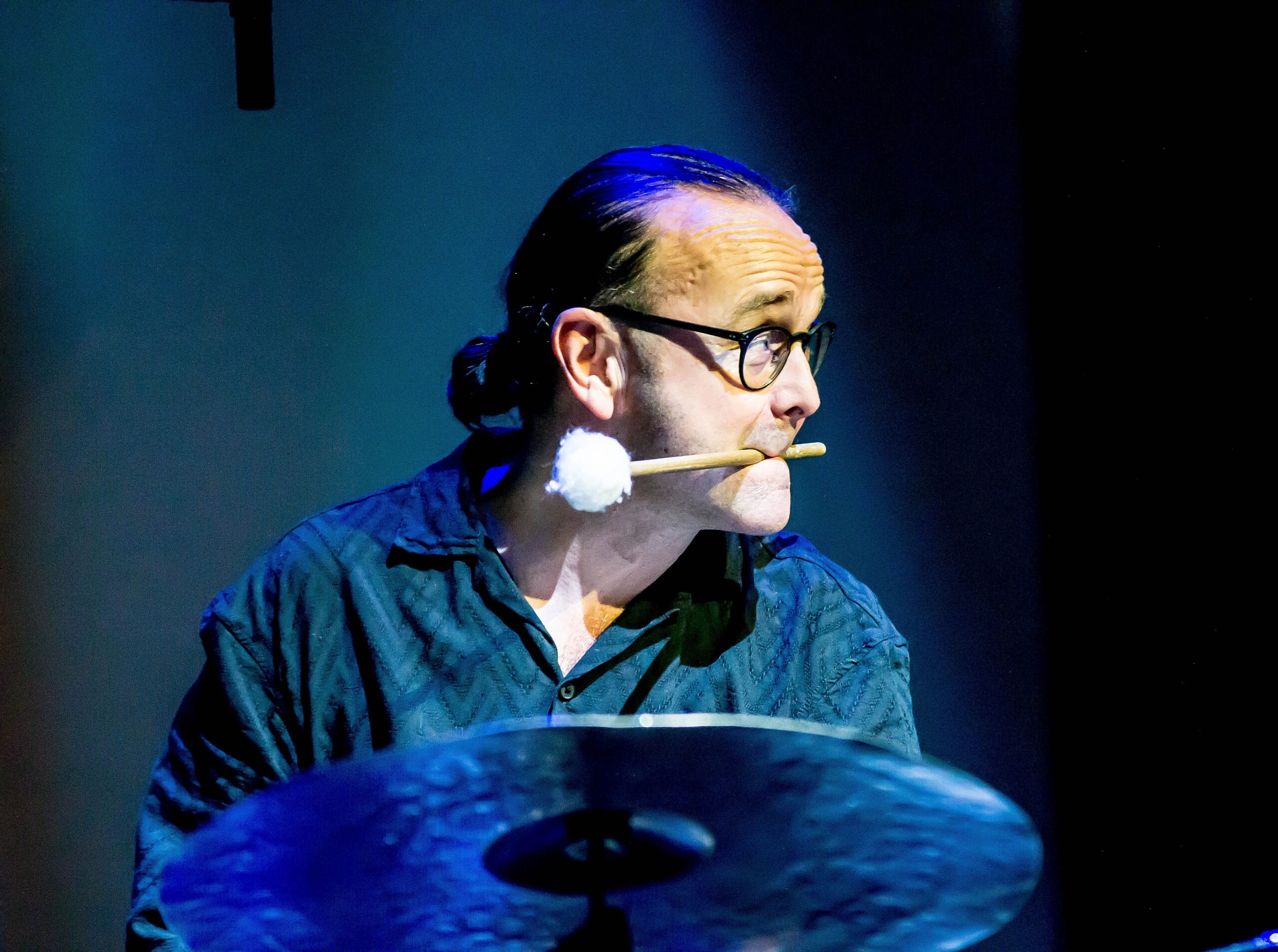Erhabene Atmosphäre flutete den Raum, genährt von mittelalterlichen Melodien und später auch mal einem Schubert-Zitat und zusammengehalten von der subtilen Klangmalerei von Schlagzeuger Lucas Niggli. Das war Stoff zum Abtauchen und Wegträumen im Zusammenwirken mit der prachtvollen Farbregie im Bühnenhintergrund des Münsteraner Theaters.