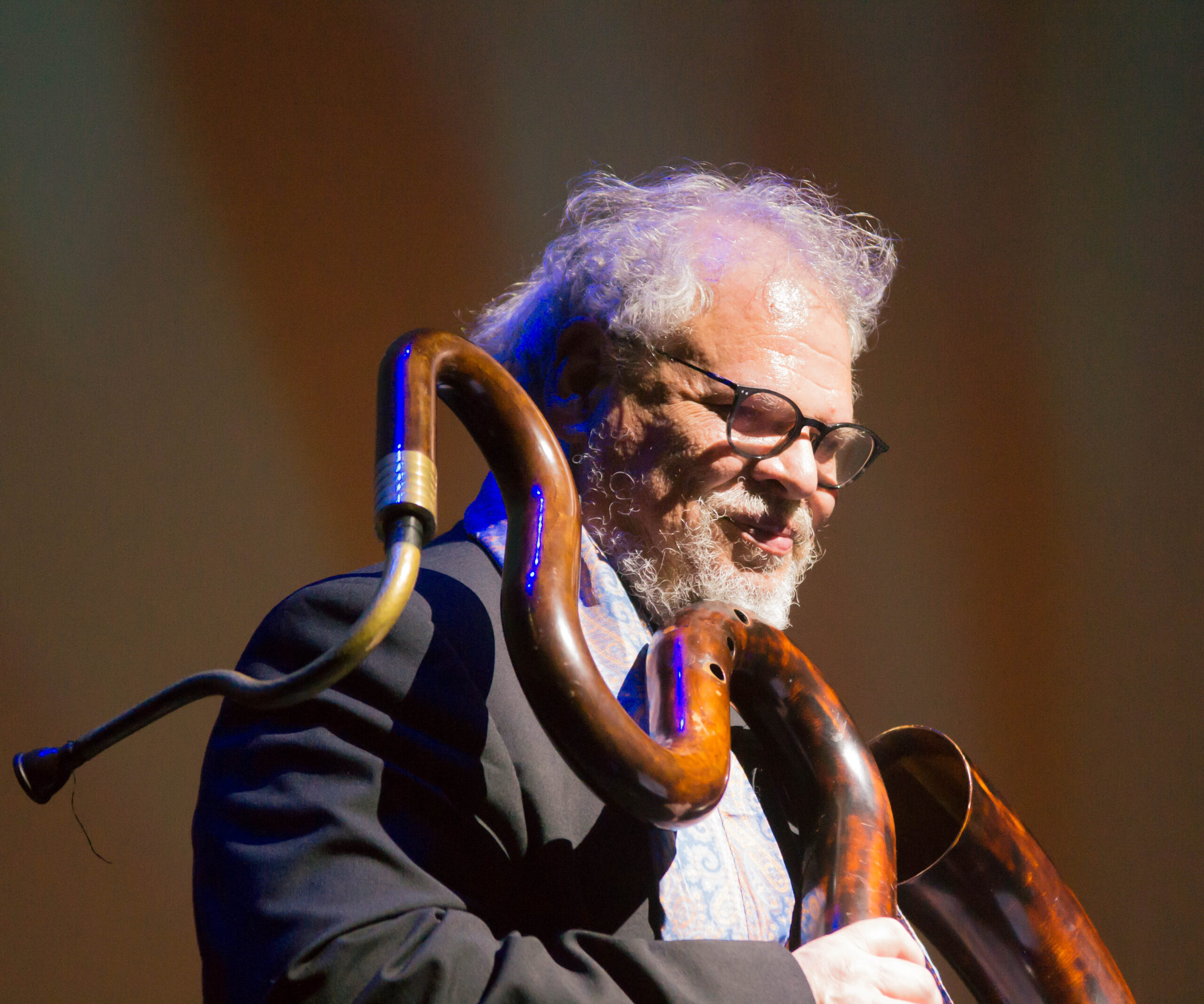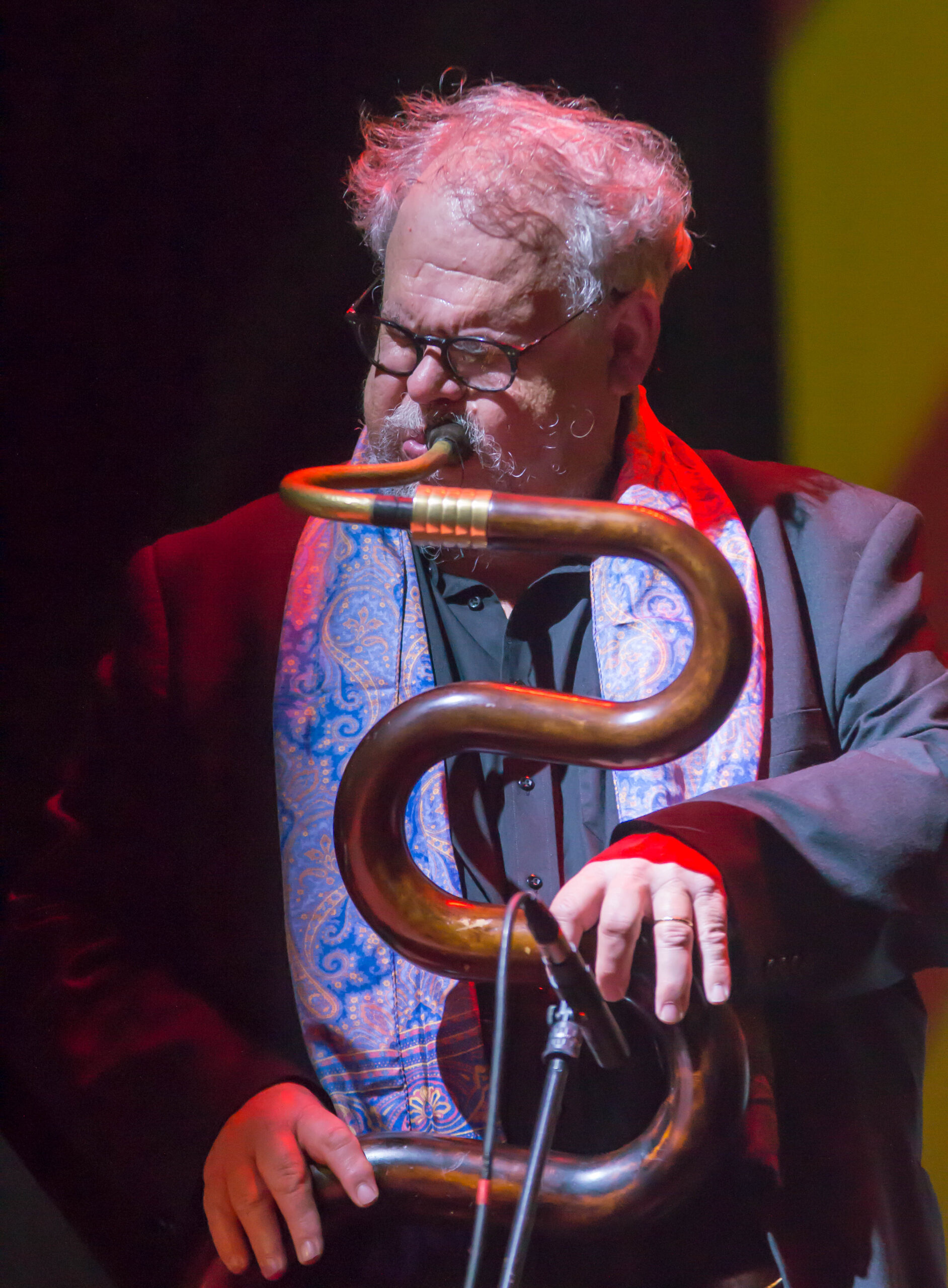 Münster hat im letzten Jahr den 375. Jahrestag des Westfälischen Friedens mit einer großen Inszenierung gefeiert. Ein riesengroßes Publikum, das den Prinzipalmarkt flutete, zeigte, dass gerade in verstörend unfriedlicher heutiger Zeit der Hunger nach pazifistischen Signalen wächst. Fritz Schmücker hatte dem Event die passenden Klänge gegeben. Unter anderem war auch der Drehleier-Virtuose Matthias Loibner mit von der Partie. Was lag also näher, als diesen idealistischen Impuls auch in die aktuelle Festivalausgabe mitzunehmen, nun zusammen mit dem vielgefragten Tuba- und Serpent-Spieler Michel Godard und dem schweizerischen Schlagzeuger Lucas Niggli. Auch diese beiden Musiker hatte Fritz Schmücker einst als überraschende Premieren aus dem Hut gezaubert. Beide sind seitdem immer wieder gern gesehen beim Münsters Jazzfestival. Hinzu kam jetzt noch die griechische Kanun-Spielerin Sofia Labropoulou, deren perkussive Saitenkunst ein hervorragendes Komplement zu Loibners sphärischem Drehleierspiel bildete.