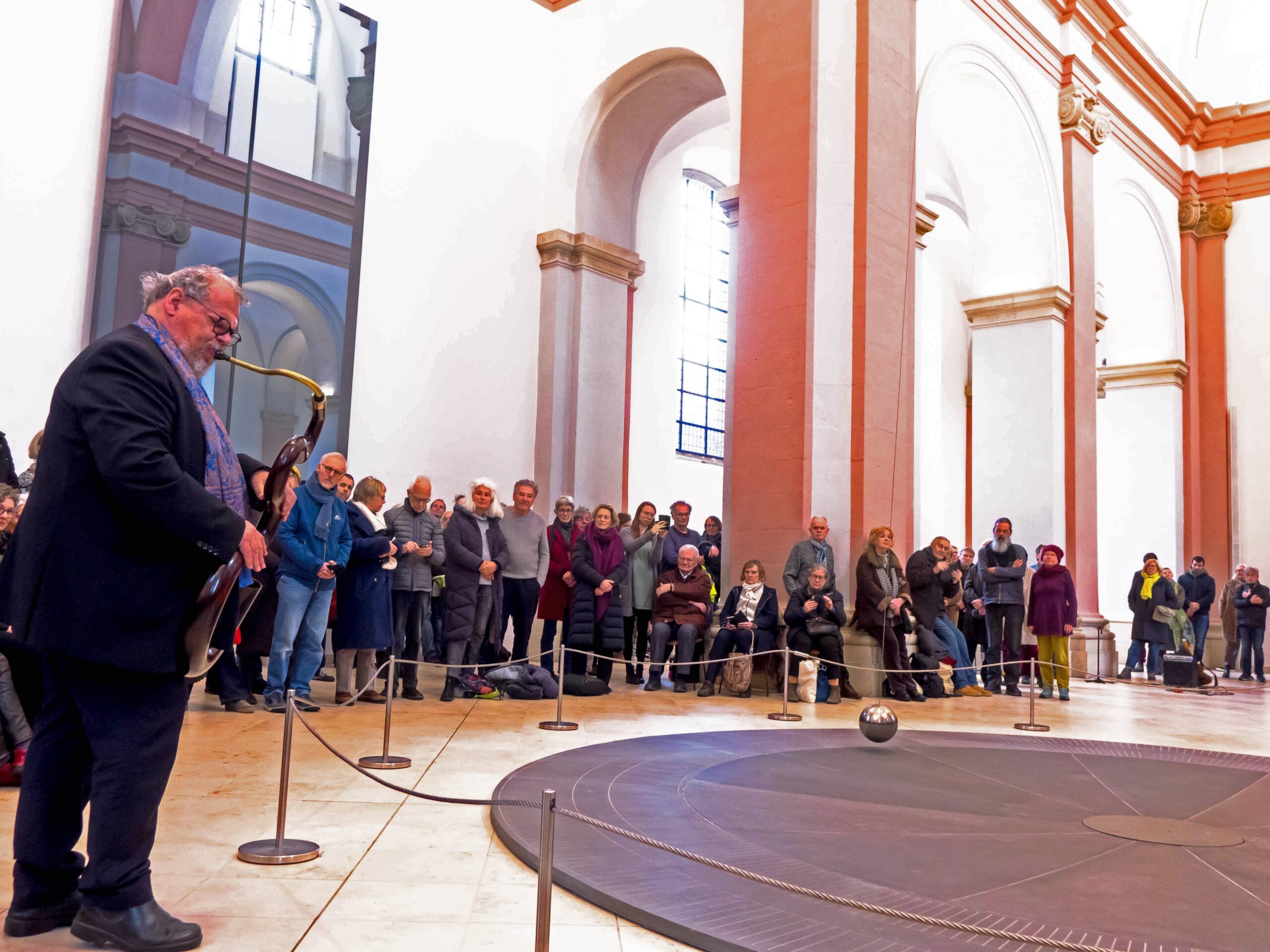 Es ist alles eine Frage des Standpunktes. Das imposante Foucaultsche Pendel, das in Münsters Dominikanerkirche an einem über 20 Meter langen Stahlseil hängt, bewegt sich eigentlich gar nicht – es ist die Erde drumherum in ihrer permanenten Rotation. Diesen Gedanken äußerte der französische Tubist, Bassist und Serpent-Spieler Michel Godard über Gerhard Richters bemerkenswertes Kunstwerk, das dieser der Stadt anlässlich seiner renommierten Skulpturenausstellung im Jahr 2018 geschenkt hat. Möglicherweise hatte Godards Nachdenken auch sein Spiel auf dem Serpent, jenem schlangenartigen Blechblasinstrument aus dem 16. Jahrhundert, inspiriert. Godards meditative Klänge schenkten dem Shortcut, der „kleinen Ausgabe“ des Internationalen Jazzfestivals Münster, ein lyrisches Finale. Teilweise spielte auch ein E-Bass mit, auf dem Godard eine Figur spielte und diese dann dem Loopgerät überließ.