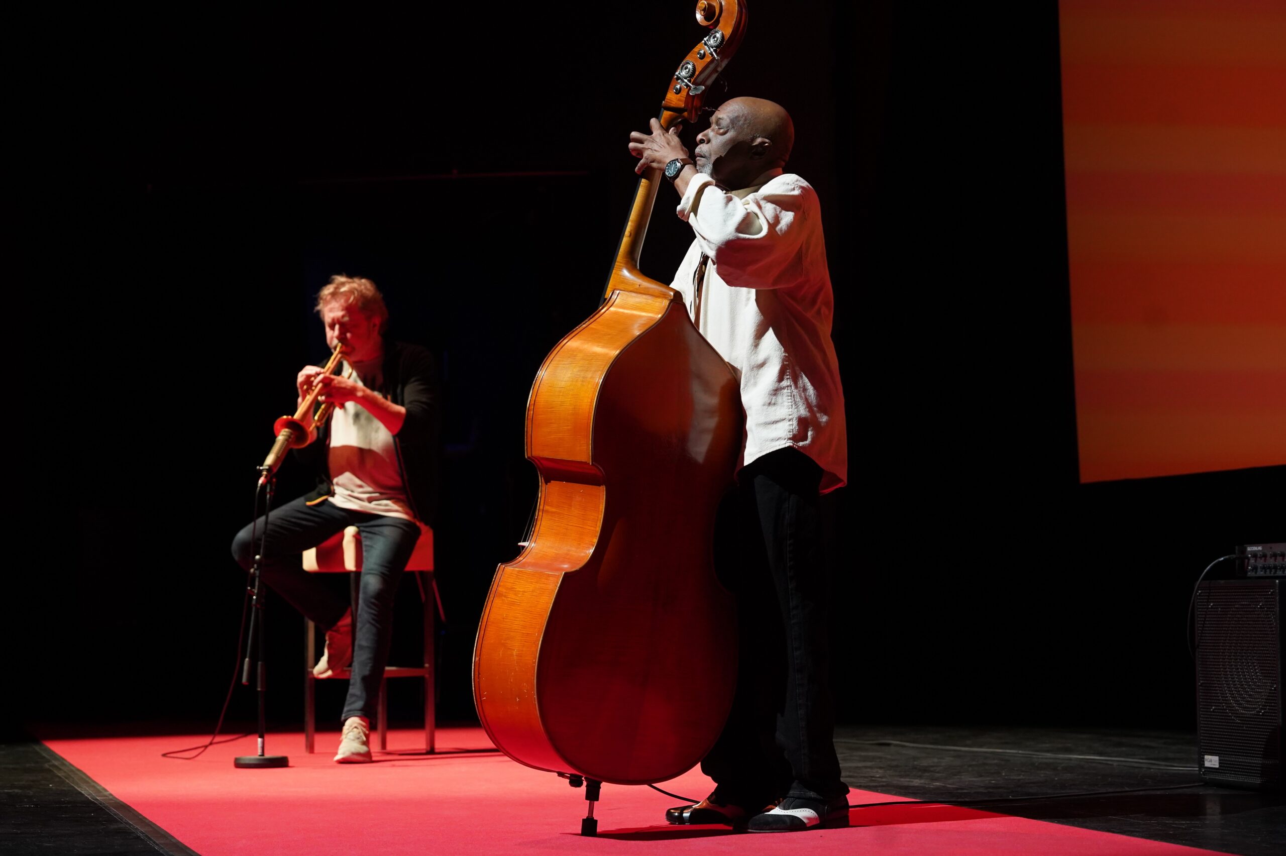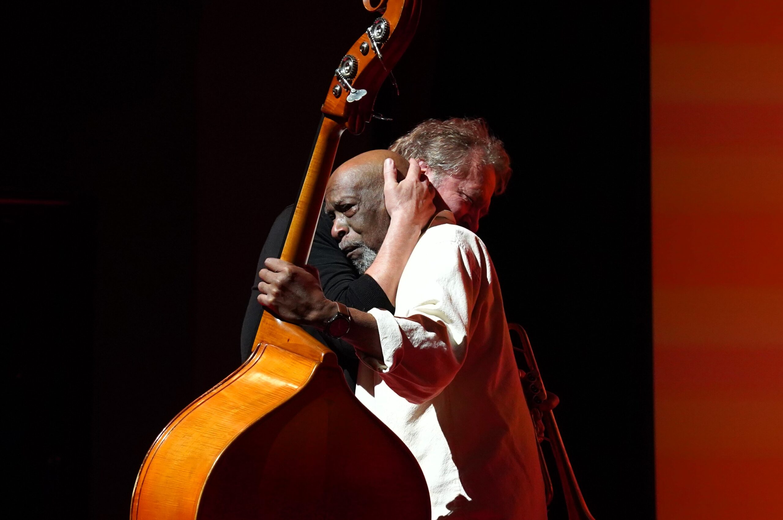 Das Beitragsbild zeigt Ernest McCarthy, den letzten Bassisten von Erroll Garner, umarmt von Trompeter Nils Petter Molvaer nach ihrem Kurzauftritt nach der Filmpremiere.