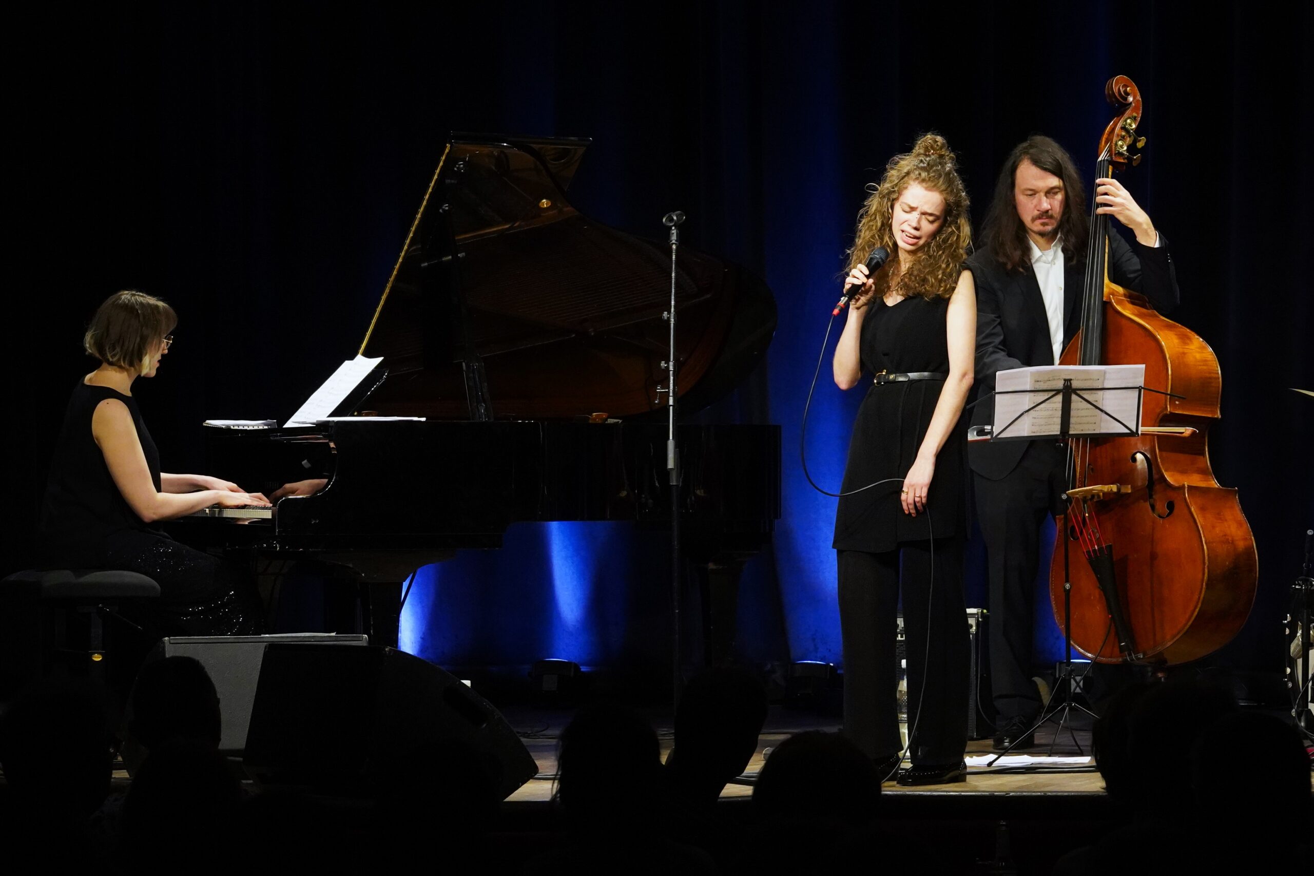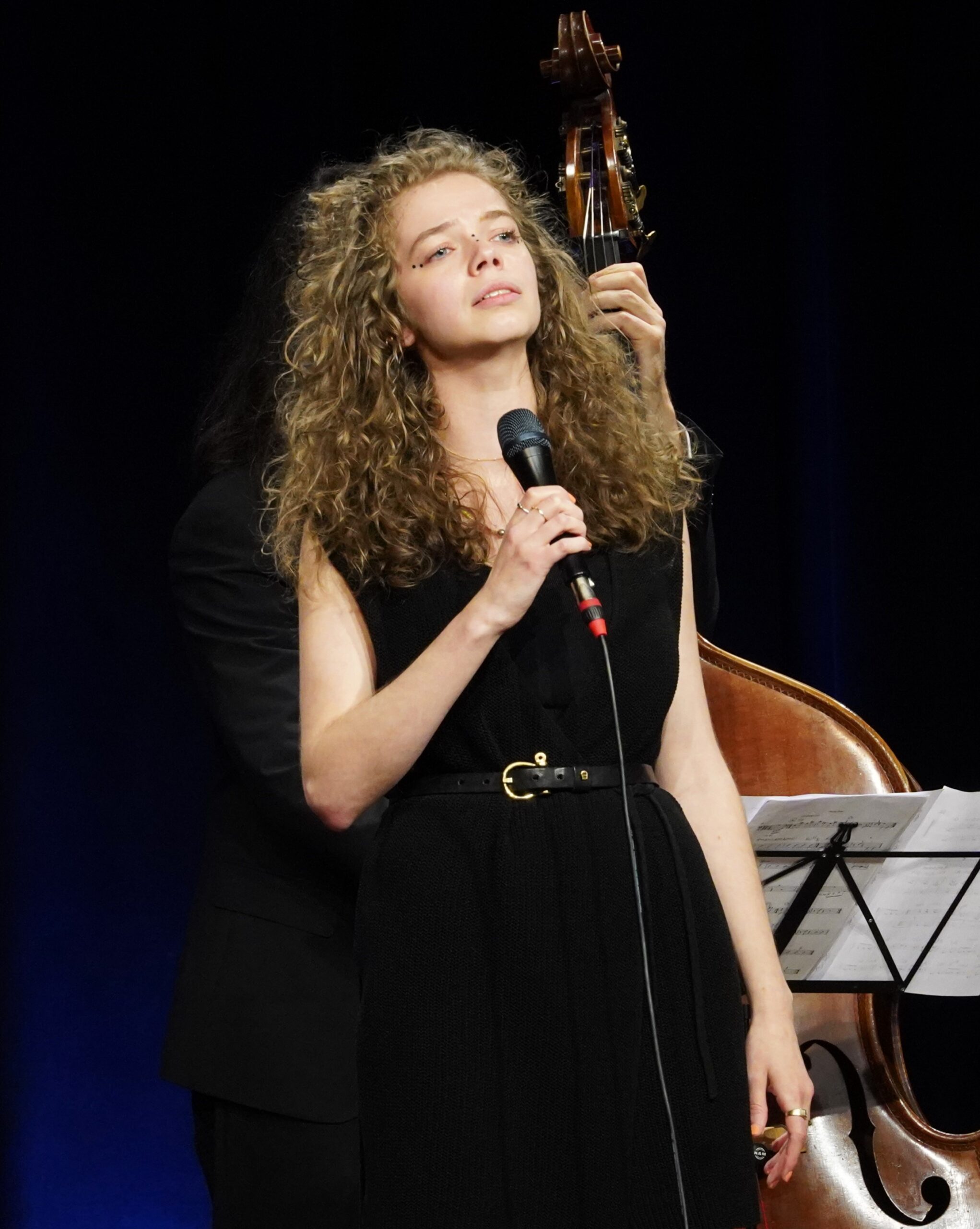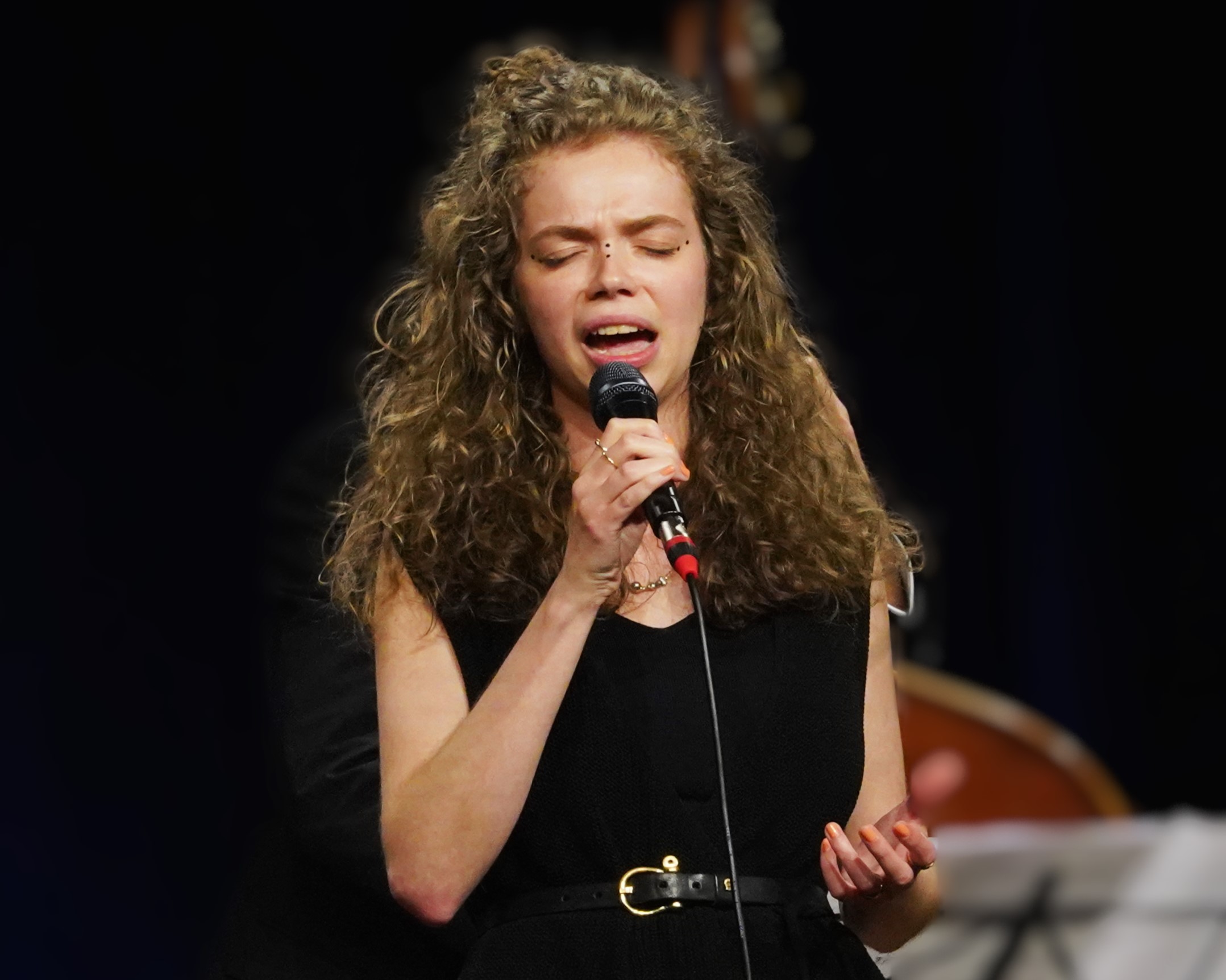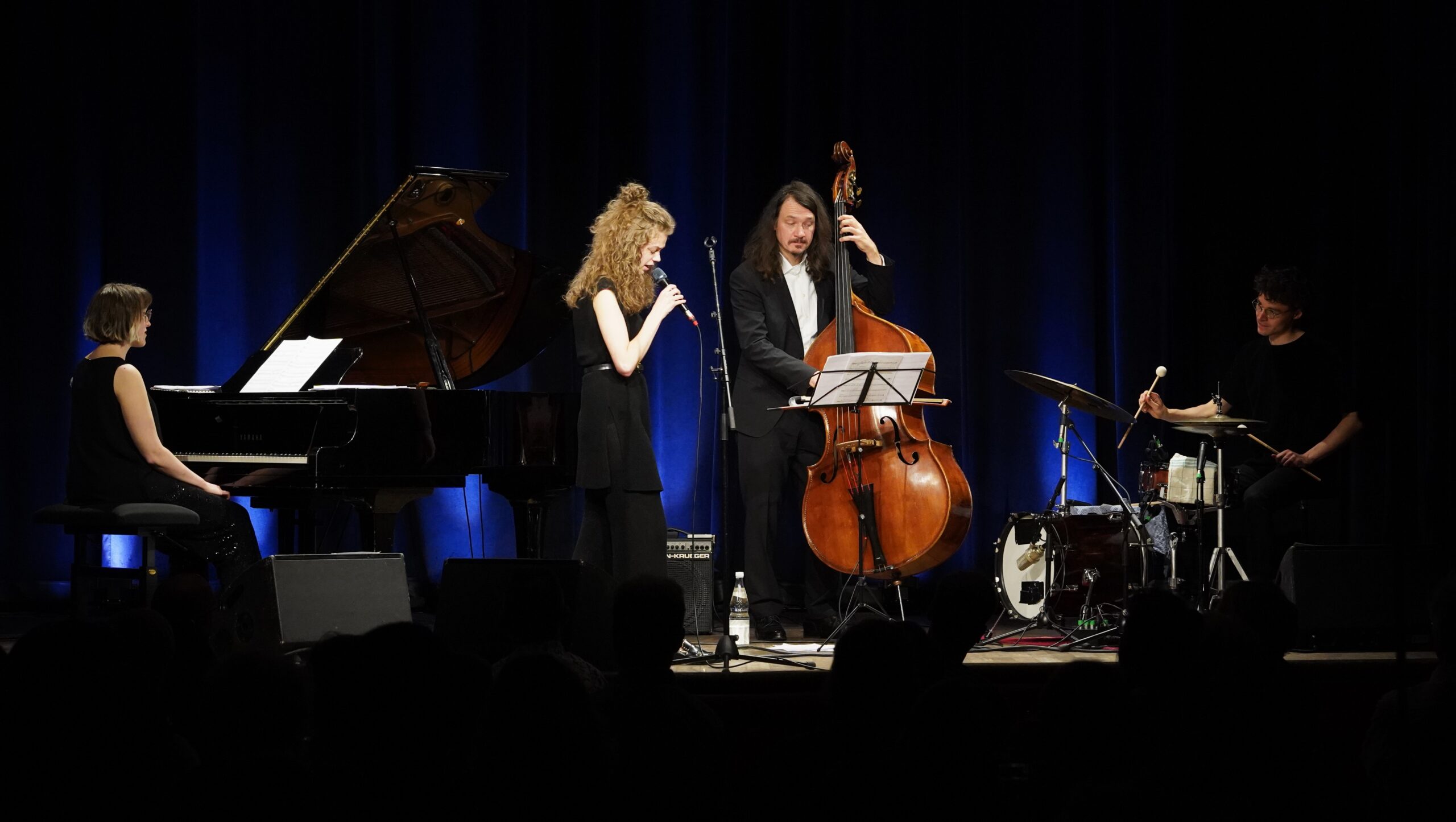 Neben dem Interplay der famosen Band und spannenden Soli war aber natürlich Fernanda von Sachsen die eigentliche Sensation. Die noch am Münchner Jazzinstitut Studierende, die – nach einem Bachelor in Ethnologie – ihr großes Potenzial als Sängerin aber bereits nachgewiesen hat: Von 2021 bis 2023 saß sie im Landesjugendjazzorchester Bayern, sie bekam Stipendien für das New York Voices Vocal Camp und die Yehudi Menuhin Live Music Now Stiftung und schob diverse Projekte bis zum eigenen Quartett an. Von Sachsen verfügt über eine herausragende Stimme: mit klassischem Fundament, glasklar, variabel, kraftvoll und mit enormer Range. Und gerade für dieses Projekt war es sicher kein Schaden, dass von Sachsen schon weit über den Jazz-Tellerrand hinausgeblickt hat (ein Bachelor in Ethnologie steht dafür) und eigentlich von der Schauspielerei kommt.