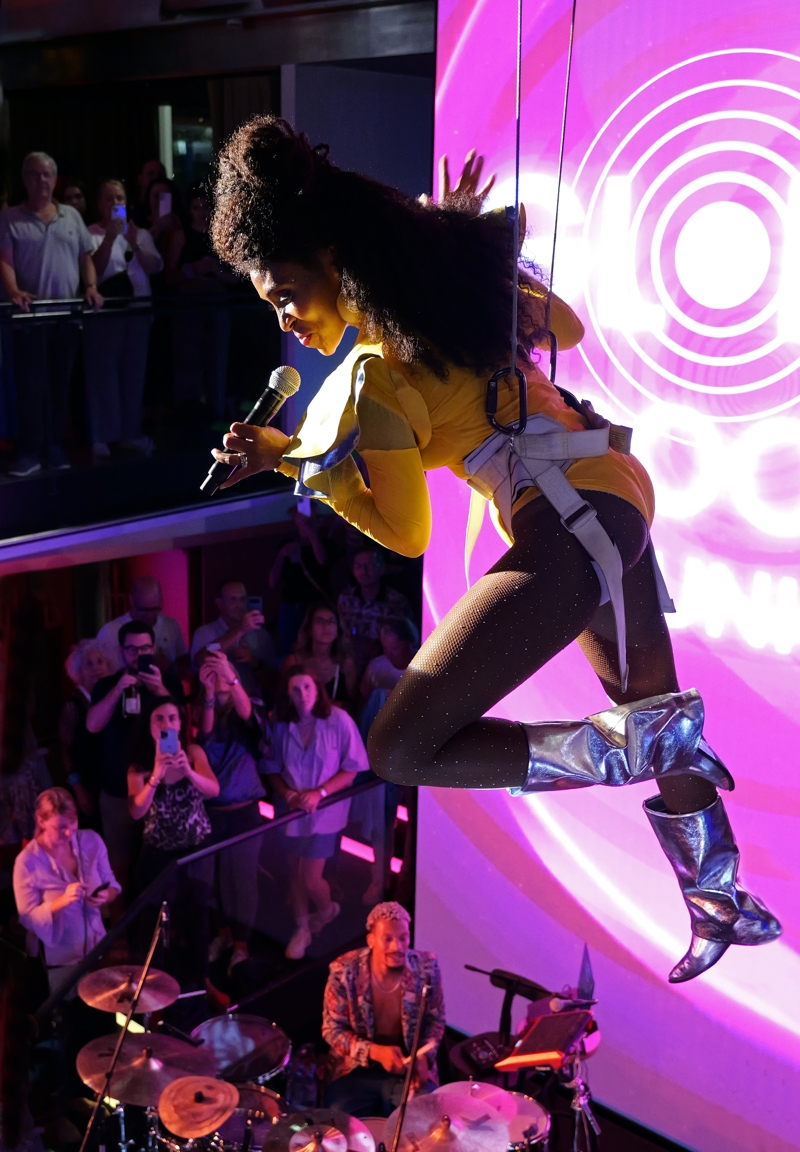 Aber damit nicht genug – plötzlich verschwand West von der Bühne, um sich dann mit ihrem Bass, drehend vom Erdgeschoss des Pavillons mit einem Deckenkran auf die Bühne im Untergeschoss ins Publikum herunter zu lassen. Derweilen spielte sie, die Menge tobte. This Show Must Go On, später bei der Zugabe „Kiss“ gab es dann, erneut von der Decke schwebend, kein Halten mehr. Nach minutenlangem, tosendem Applaus gab es noch eine zweite Zugabe: Ike & Tina Turner‘s „Proud Mary“ als funkgetränkte Ballade zum Ausklang eines unvergesslichen Konzertabends.