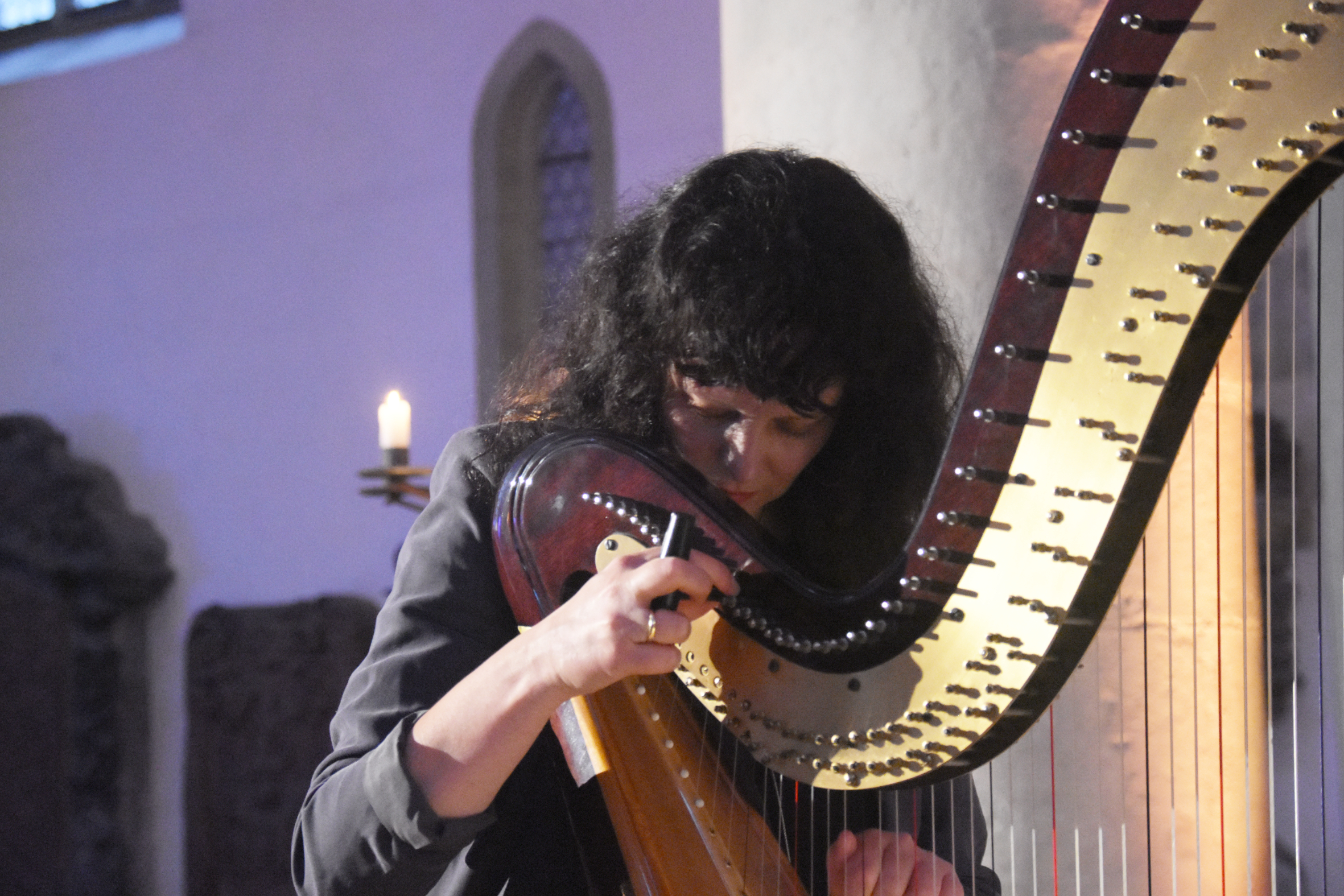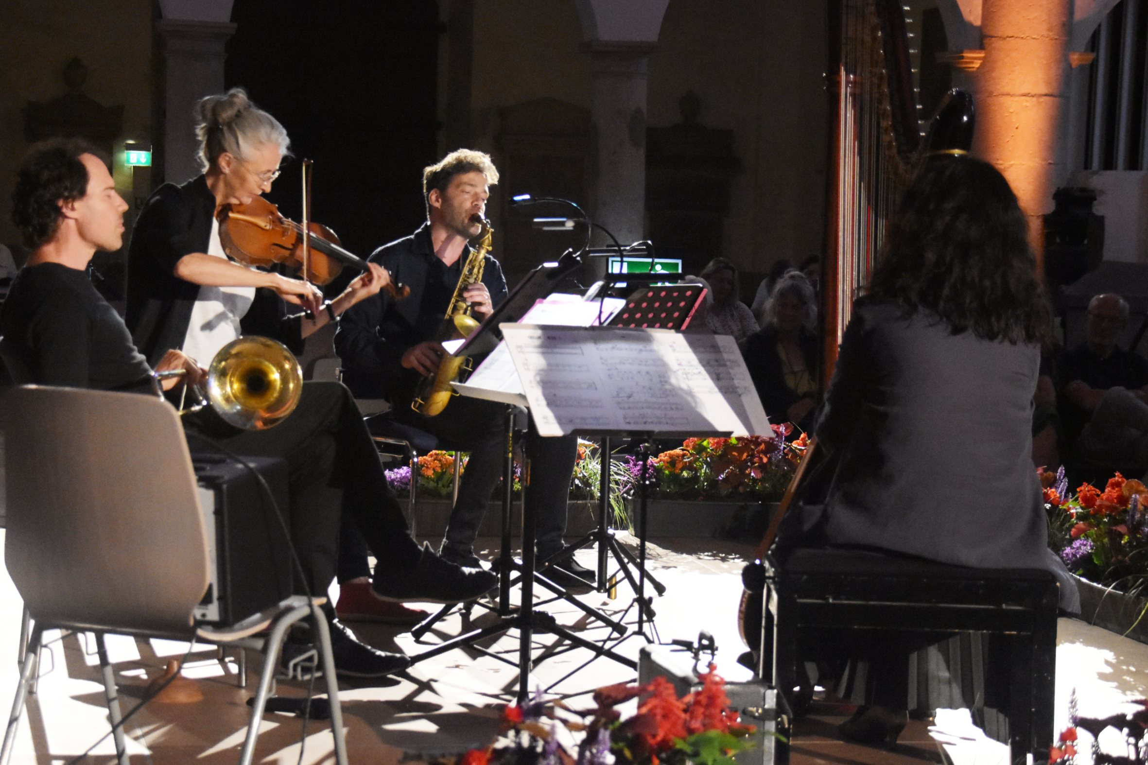 Die sinnlich-dunkle Stimmung durchbricht Weidner mit einer hellen Melodielinie, die den Raum erfüllt und aufleuchten lässt. Der Altsaxofonist ist, ebenso wie die fantastische isländische Violaspielerin erst wenige Tage zuvor zur Band gestossen. Die beiden haben Hayden Chisholm (as) und Gareth Lubbe (viola, v) ersetzt, die für diesen Auftritt verhindert waren. Nach nur zwei Proben waren sie mit den Stücken des gleichnamigen Albums und den beiden anderen Musiker so vertraut, dass ihr gemeinsames Konzert wie aus einem Guss geklungen hat. Auch auf den langen Nachhall des hohen Kirchenraums hatten sie sich beim nachmittäglichen Soundcheck bestens eingestellt und spielten, bis auf die Harfenistin, unverstärkt mit verhaltener Dynamik.
