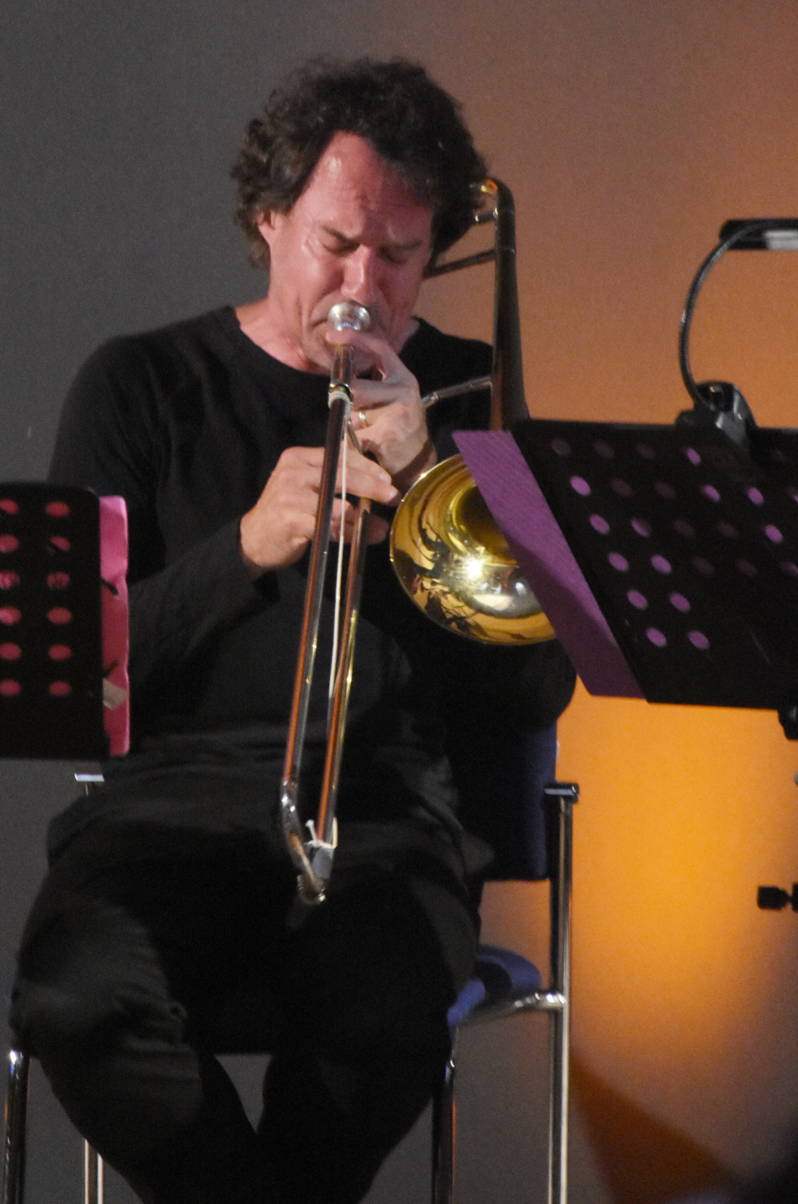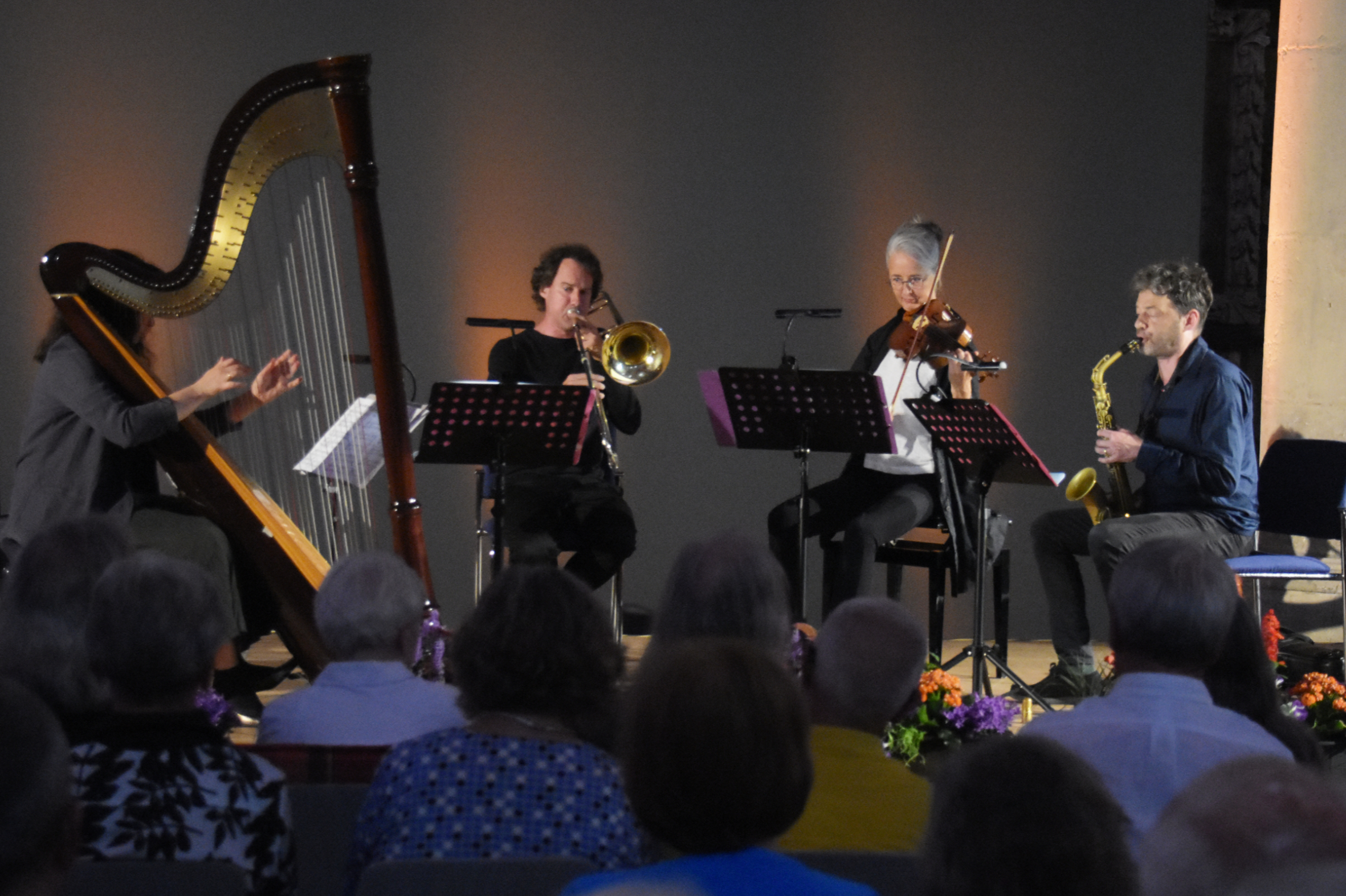 Nichts davon in der Musik von Wogram. Als Komponist hat er für diese spezielle, mutmaßlich einmalige Besetzung im zeitgenössischen Jazzgeschehen, eine ruhige Musik voller Klangschattierungen und subtiler Färbungen geschrieben. Auf der gedämpften Posaune durchbricht er selbst die erwartungsvolle Stille im Kirchenschiff, in dem er fast zärtlich verhalten mit einem Riff einsetzt, zu dem sich nach einigen Takten die Harfe als begleitende Stimme gesellt.