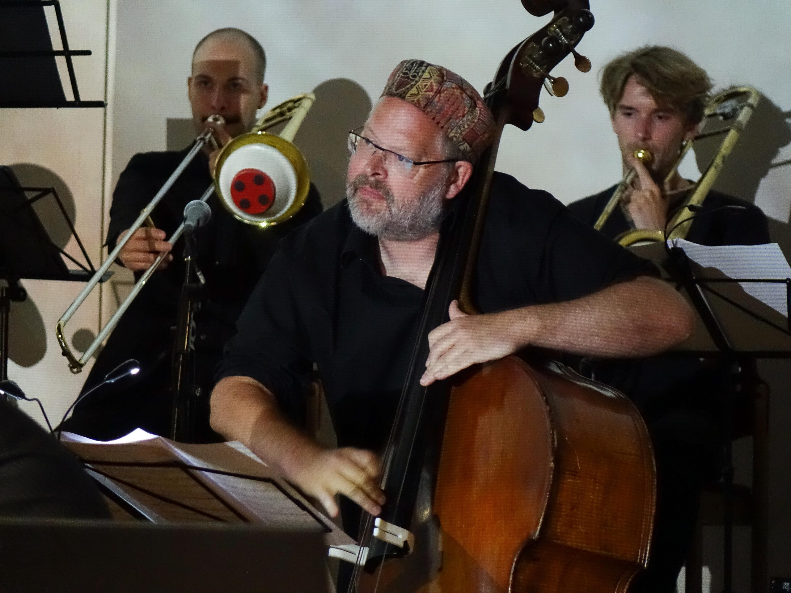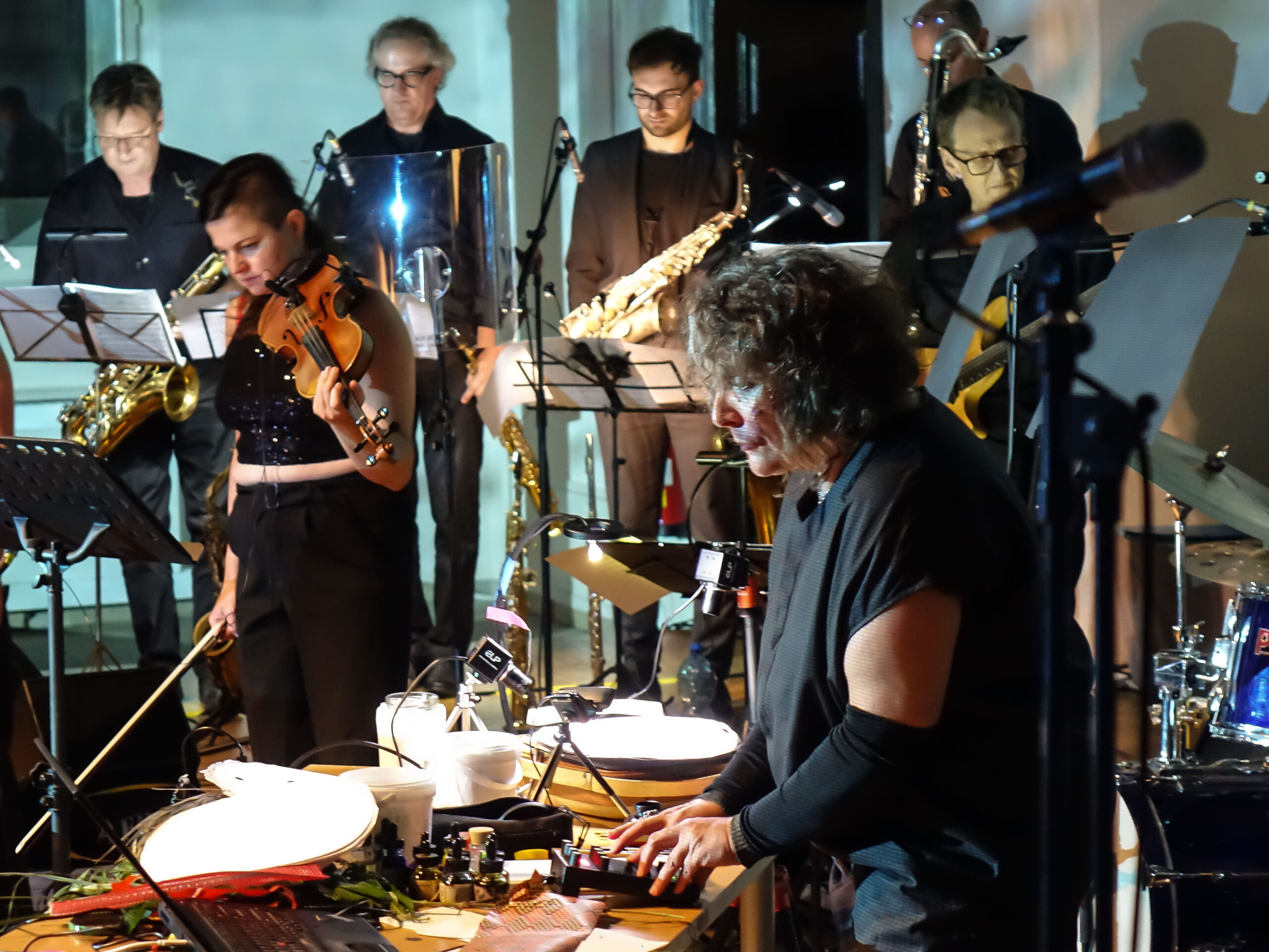 Also wirkten auch die zwei Sets in Wuppertal wie eine seismografische Echokammer für die Emotionen dieser Welt – man kann hier auch ruhig mal den Terminus „Jazzoper“ strapazieren. Caroline Ton führte im ersten Teil die Feder – es ging um Räume, um ästhetische Reflexionen unserer oft dystopischen Realität. In den tiefen, dunklen Klangfarben spiegelte sich die Zerrissenheit unserer Zeit. Das Orchester brandete auf, entfesselte sich in kollektiven Improvisationen und fand immer wieder zu lyrischen Ruhepunkten zurück. Geerdet in menschlicher Wärme, die das Spiel aller Beteiligten durchzog.