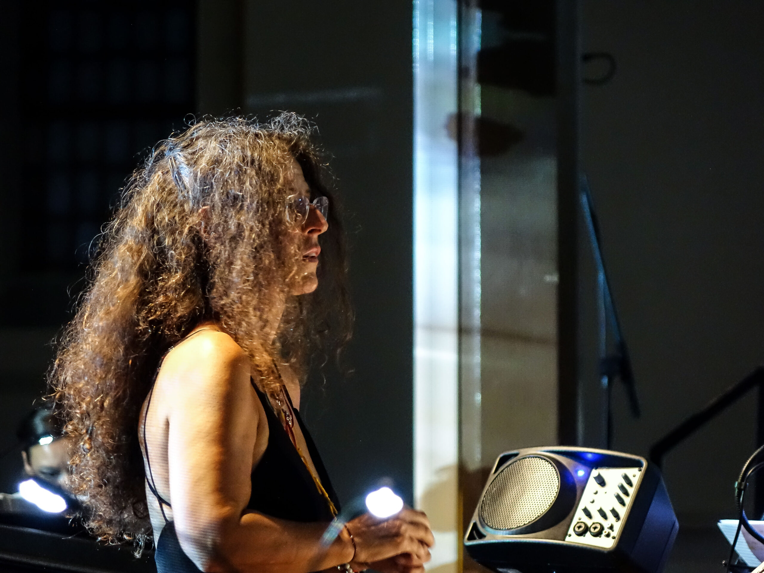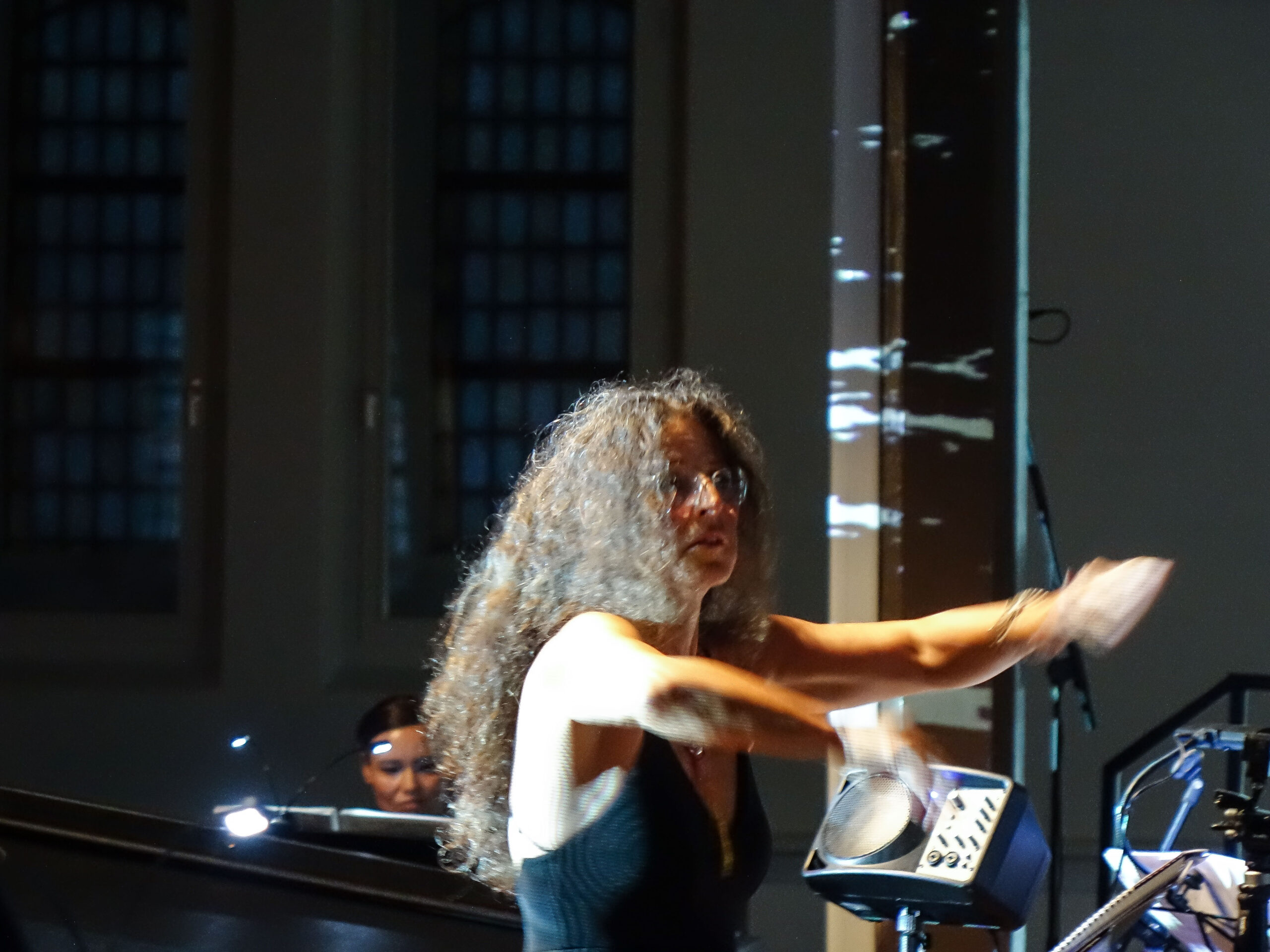 Das synästhetische Gesamterlebnis wurde durch innovative Lichtkunst perfektioniert. Claudia Schmitz, eine Visual Artist mit Leib und Seele, kreierte eine visuelle Welt, die den Raum mit rotierenden geometrischen Figuren und abstrakten, wuchernden Lichtmustern füllte. Texturen aus Licht und Formen breiteten sich unvorhersehbar aus und waren so intensiv aufgeladen wie die Klangeruptionen des großen Ensembles. Eine Kombination aus punktuellen Farbtupfern und suchscheinwerferartigem LED-Licht durchzog den Raum, während Soundwände aus sattem Blech und sphärischen Elektronikklängen das Publikum umfingen. Die analoge Kunstform von Schmitz, die mit Papierobjekten arbeitete und diese projizierte, schuf eine visuelle Wucht, die dem Energielevel des Orchesters ebenbürtig war.