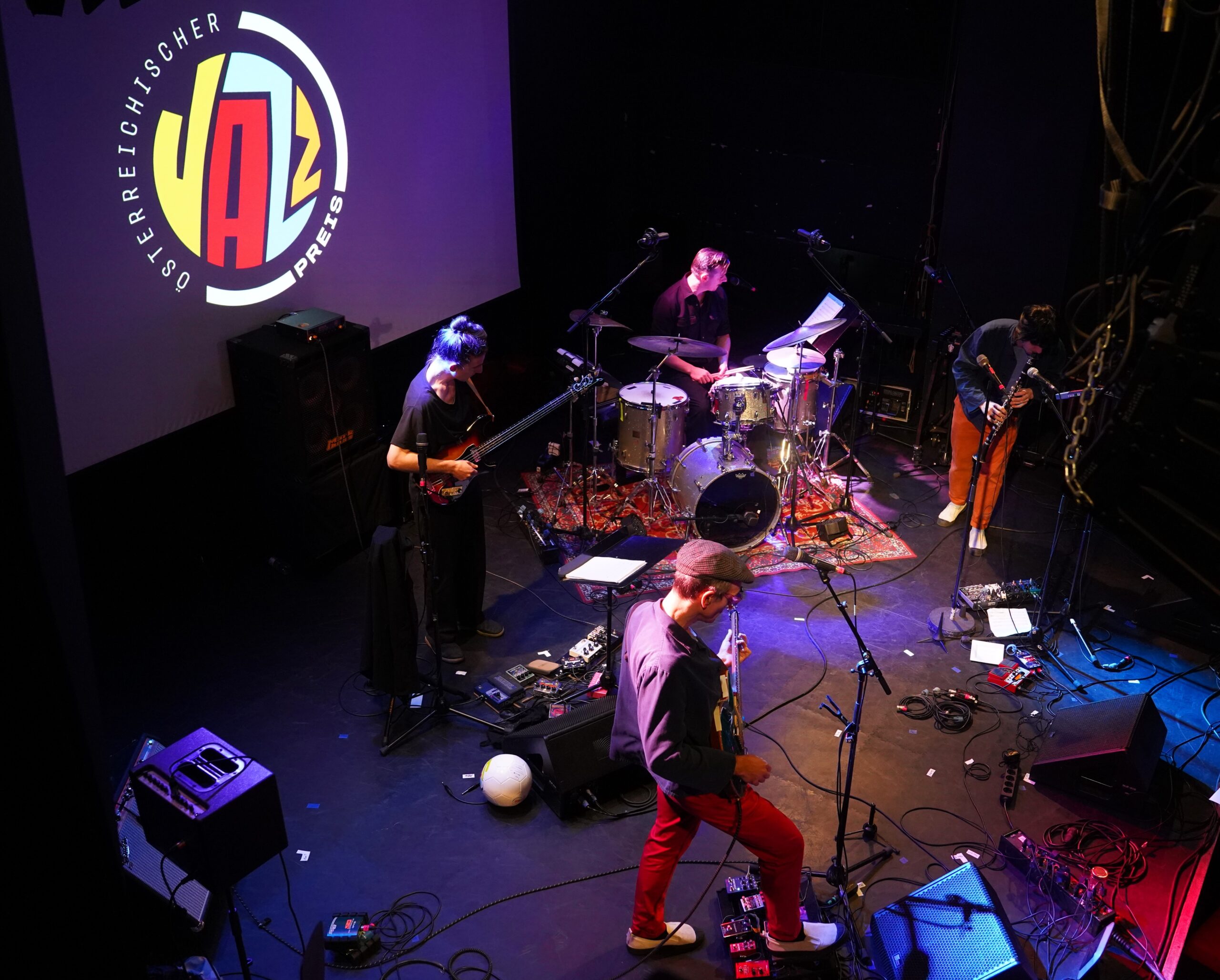 Und auch gegen die drei Preisträger lässt sich schwer argumentieren. Mit dem Klarinettisten und Komponisten, überdies hinaus auch filmendem Konzeptkünstler Vincent Pongracz und seinen Synesthetic 4 (es gibt das Projekt auch in größerer Besetzung) hat man mit einiger Berechtigung den „Best Live Act 2024“ gefunden. Wie einige Festival-Auftritte diesen Jahres, aber auch die halbe Stunde im Porgy & Bess bewiesen. Pongracz überlässt seinen Mitstreitern Peter Rom an der Gitarre, Manuel Mayr am Bass und Andreas Lettner am Schlagzeug gern das Feld seiner durchaus komplexen und vertrackten, aber immer einer Geschichte verpflichteten Stücke zur Ausgestaltung. Nicht zuletzt dank der schon durch Pongracz Perücke angedeuteten ironischen Brechung und skurrilen Videomontagen zu zwei Songs wird dieser Jazz auf der Bühne zum Gesamtkunstwerk.