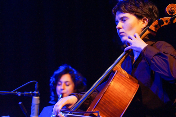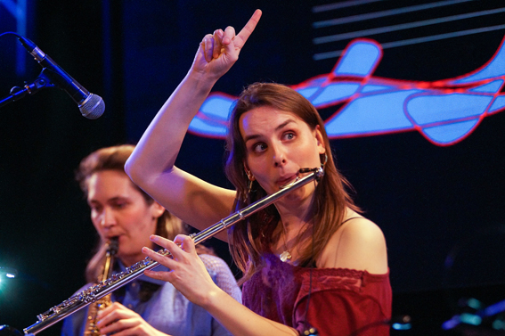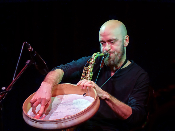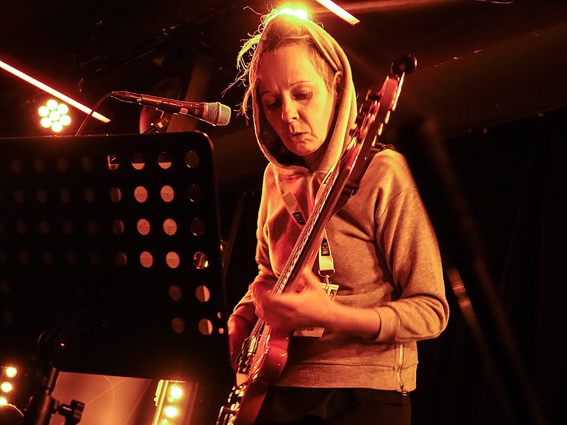 In Fabian Dudeks „Recent“ entfaltete sich ein ganz anderes ruheloses Kräftefeld von hypnotischer Wirkung. Das war vor allem der Verdienst der aus London angereisten, aus Südtirol stammenden E-Bass-Aktivistin Ruth Goller, und die setzte auch zuverlässig ihre dystopischen Bass-Drones unter Feuer. Um diese sich immer wieder aufs Neue offenbarende Emanzipation des E-Basses als expressive Stimme schepperte, zimbelte, waberte es in allen möglichen Klangschichten. Der eigentliche NICA-Artist Fabian Dudek legte wirkungsvoll flirrende Flötensoli über Trommelwirbel und rauschende Becken, erst später kam auch sein Saxofon zum Einsatz. Mehr ungezügelte kreative Energie lässt sich wohl kaum auf einer Bühne entfesseln.