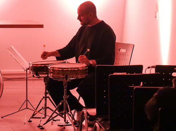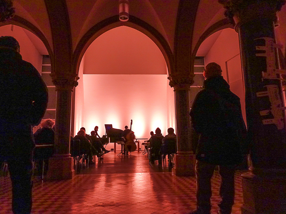 Nur wenige Schritte vom Stadtgarten entfernt befindet sich eine ganz besondere Spielstätte, die eben zu einer solchen wird, weil man die Potenziale erkannt hat. In monochromen Farben agierten hier zum meditativen Finale drei Persönlichkeiten, kaum konkret sichtbar, weil eben nur die Schattenrisse sichtbar waren. Und nach den vielen Tönen der anderen Bands ging es hier ums Gegenteil: Eine einzige, stationäre, sich ständig subtil verändernde, in immer neuen Schattierungen auflebende Schwingung vereinte sich mit der Lichtstimmung und dem ganzen Raumerlebnis zu einem sphärischen Ganzen. Zu verdanken war dies dem besonderen „Schlagzeugspiel“ von Etienne Nillesen, der permanent zwei Stäbchen über seine beiden Snaredrums strich, komplettiert von ähnlichen Effekten auf dem Kontrabass des NICA-Artists Stefan Schönegg und vom präparierten Klavier von Marlies Debacker.