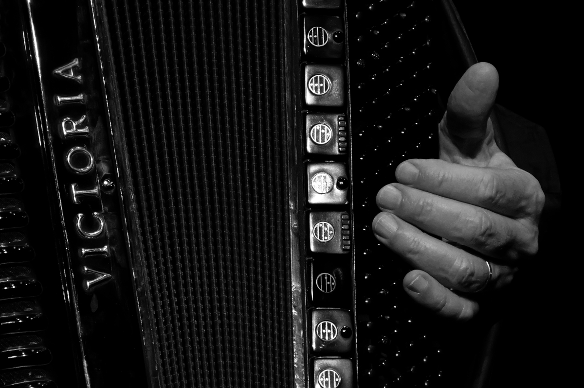 Galliano sitzt im Prinzregententheater nicht nur in der Mitte der Bühne, er markiert auch musikalisch so etwas wie die wandungsfähige Mitte des Trios: mal compt er wie ein Jazzpianist, mal lässt er sein Akkordeon mächtig wie eine Kirchenorgel brausen, häufig wird er – gerade in den kunstvoll variierten Codas – in den allerhöchsten Registern seines Instruments so leise, als ob sich Töne in Licht verwandeln ließen. In manchen Stücken wie dem seiner Enkelin zugeeigneten „Lili“ bläst Galliano sein Melowtone (https://melowtone.com/en/melowtone-en/), eine Art Mundharmonika mit Akkordeon-Tasten, auf der Galliano wie ein Klarinettist oder Saxophonist klingt.