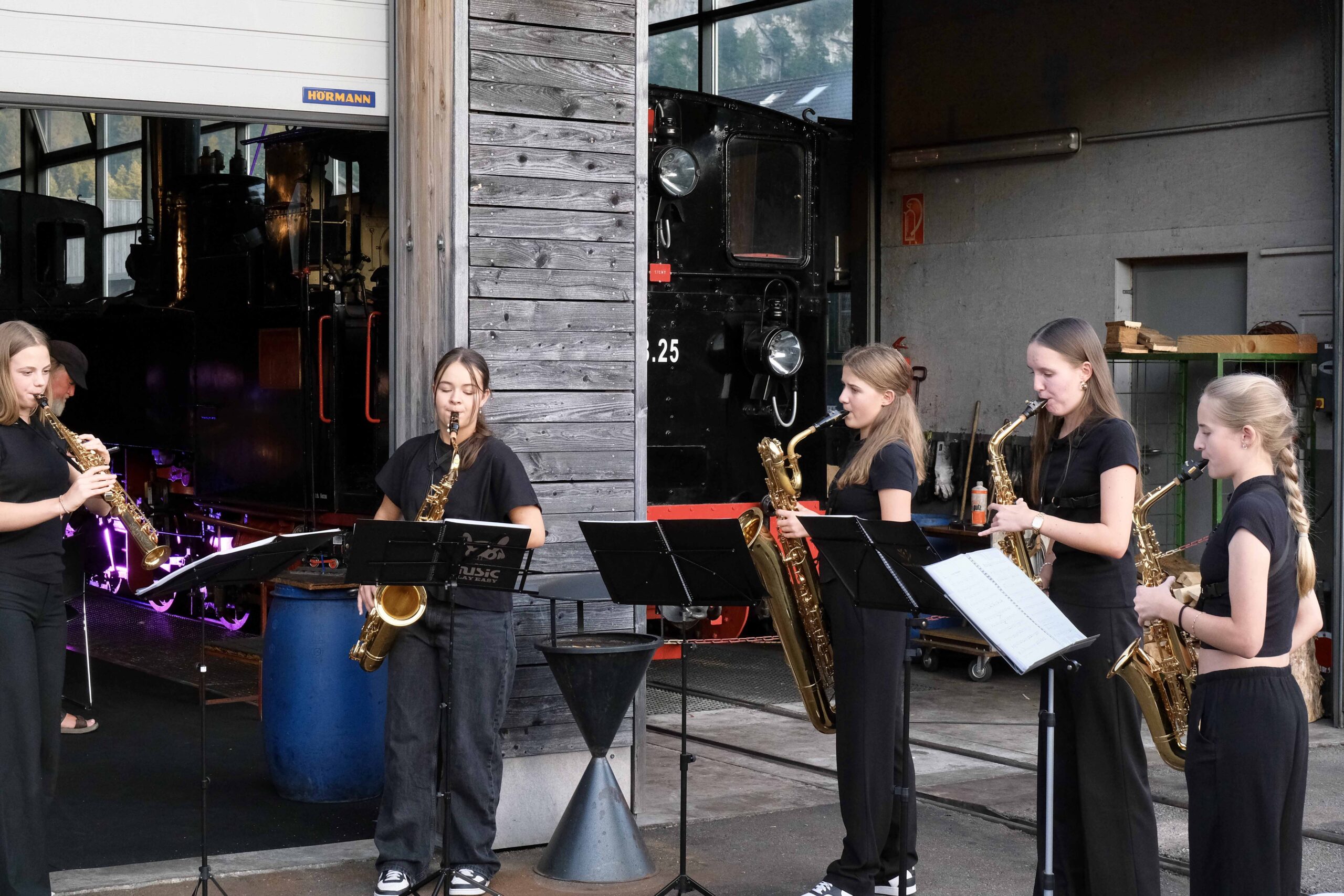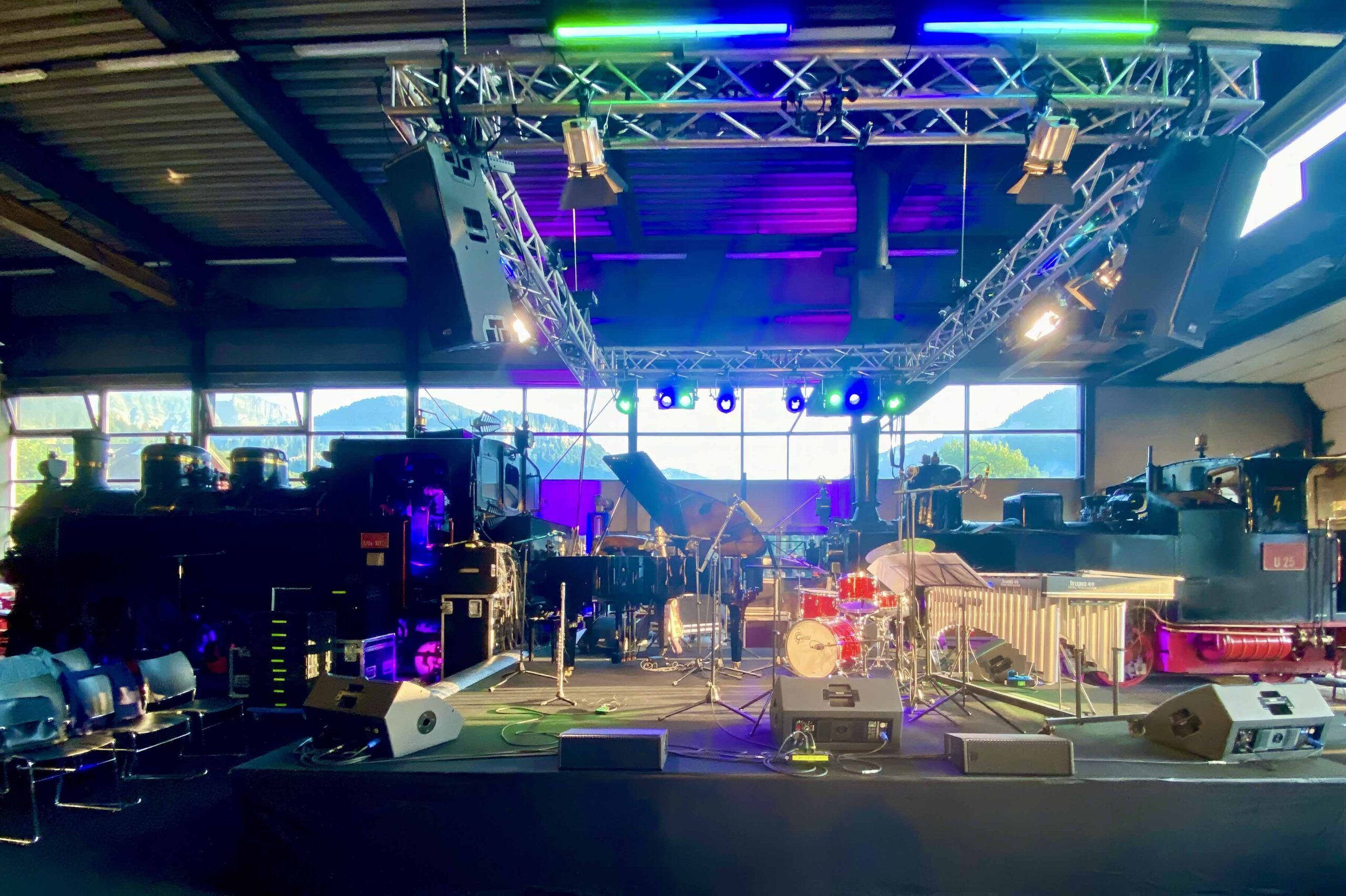 Mit einem Festivalpass für alle vier Tage vom 7. bis zum 9. August hatte man die Qual der Wahl: Den Auftakt in der Lobby des Hotels Post machte Max Stadtfelds „Stax“ – ein Quartett aus dem namengebenden Schlagzeuger und Komponisten, Matthew Halpin am Saxophon, Bertram Burkert an Gitarre und FX sowie Reza Askari am Bass. Neben einem breiten Spektrum unterschiedlichster Konzerte wurden aber auch „Deep Listening Sessions“ in einem Seminarraum im selben Hotel, eine Fahrt mit dem dampflokgezogenen Wälderbähnle, ein mittäglicher Ausflug mit Jazzspätzle zum (Berg-)Panoramarestaurant Baumgarten, eine Workshop-Performance „Hear and Now“ in der Mittelschule Bezau sowie afrikanische Rhythmen und Tänze auf dem Dorfplatz von Bezau geboten. Die im letzten Jahr angekündigte Fortsetzung einer zunächst dem Schlagzeug gewidmeten Gesprächsreihe, in der es diesmal um den Bass hätte gehen sollen, entfiel leider – hier hoffen wir auf das kommende Jahr.