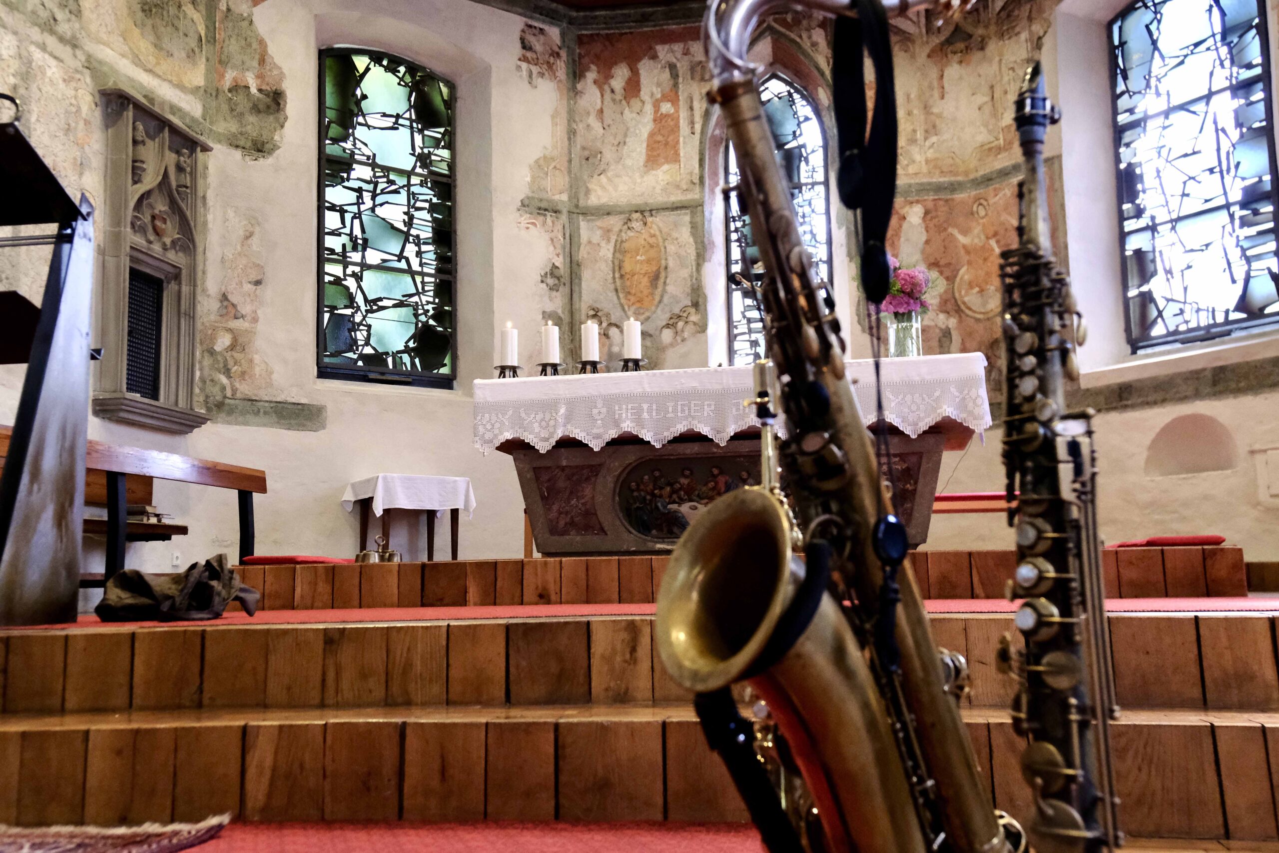 Den eigentlichen Höhepunkt des Festivals allerdings hatten zu diesem Zeitpunkt einige schon erlebt. Und zwar auf völlig unerwartete Weise. Schon um elf Uhr morgens fand sich das gerade erst noch den letzten Schlaf aus den Augen reibende Publikum in der römisch-katholischen, mit schönen Fresken geschmückten Pfarrkirche Reuthe ein, um ein „Blaskonzert“ der ganz besonderen Art zu erleben. „Ward 4“ nennt sich das Quartett des litauischen Saxophonisten Liudas Mockūnas, zu dem mit Simonas Kaupinis und Mikas Kurtinaitis gleich zwei (ganz links und ganz rechts vor dem Altarraum positionierte Tubisten sowie der Schlagzeuger Arnas Mikalkėnas gehört. Letzterer sei „eigentlich ein Pianist“, wusste Liudas Mockūnas zu berichten, „der zum Schlagzeug wechselte, um nicht immer auch Synthesizer spielen zu müssen“.