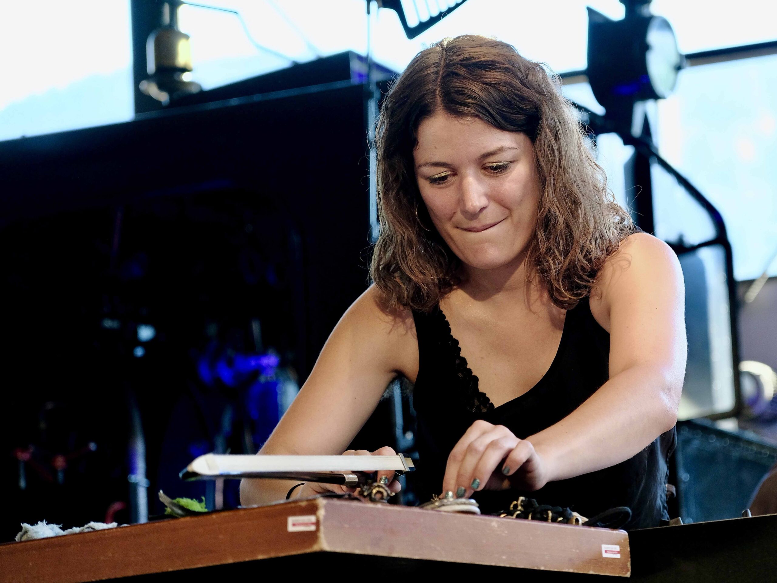 Was man unter einem weiteren, als „Promoters Brunch“ angekündigten Programmpunkt zu verstehen hatte, klärte sich erst vor Ort in der Kunstschmide Figer: Je ein Konzert von Alfred Vogel mit der Band „How Noisy Are The Rooms?“ und von Valentin Schuster als Schlagzeuger der Band „Crutches“, bei dem am Schluss alle Mitglieder beider Bands – neben den beiden Promotern Almut Kühne (Stimme), Joke Lanz (Turntables), Jan Frisch (Gitarre und Bass), Laure Boer (Telefon, Steine, Monochord, Electronics) sowie Olga Reznichenko (Keytar, Bass Synth) – miteinander jammten.