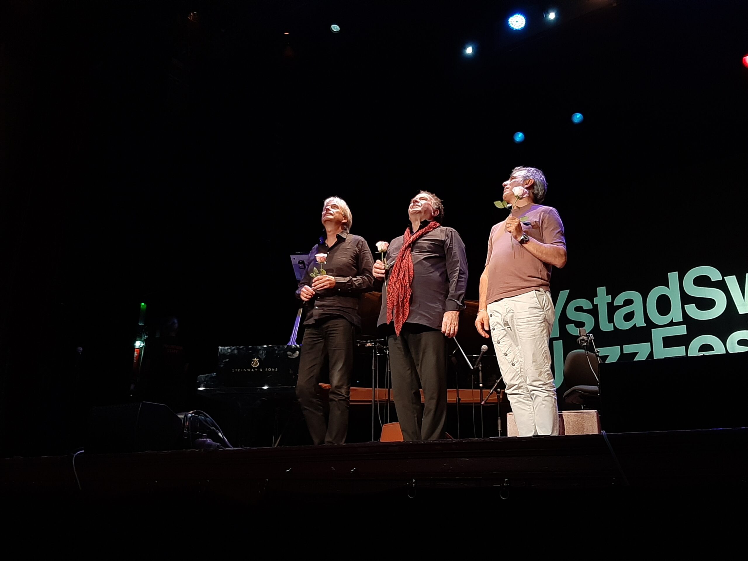 Beim Ystad Sweden Jazz Festival ist es Tradition, dass auch der künstlerische Leiter der Veranstaltung, der international renommierte Pianist Jan Lundgren, in meist zwei Projekten selbst auftritt. Diesmal war er beide Male in einem Trio zu erleben. Das eine war „Mare Nostrum“ mit dem französischen Akkordeonisten Richard Galliano und dem italienischen Trompeter und Flügelhorn-Spieler Paolo Fresu (jetzt zum wiederholten Male in Ystad gefeiert): Standing Ovations gab es für den lyrischen Zauber dieses klanglich und stilistisch weit offenen Ensembles, das ganz auf starke Melodien setzt. Das Konzert schloss mit der Instrumentalversion des Chansons „Que reste-t-il de nos amours?“ (Was bleibt von unseren Liebschaften?) des Franzosen Charles Trenet – mit Fresus warmtönendem Flügelhorn – und einer Anleihe von Claudio Monteverdi, die mit gestopfter Trompete wie aus erhabener Ferne erklang, „Si dolce è il tormento“ (So süß ist die Pein), und enthielt auffällig viele private Huldigungen, etwa an die Partnerin oder auch an zwei Hunde.