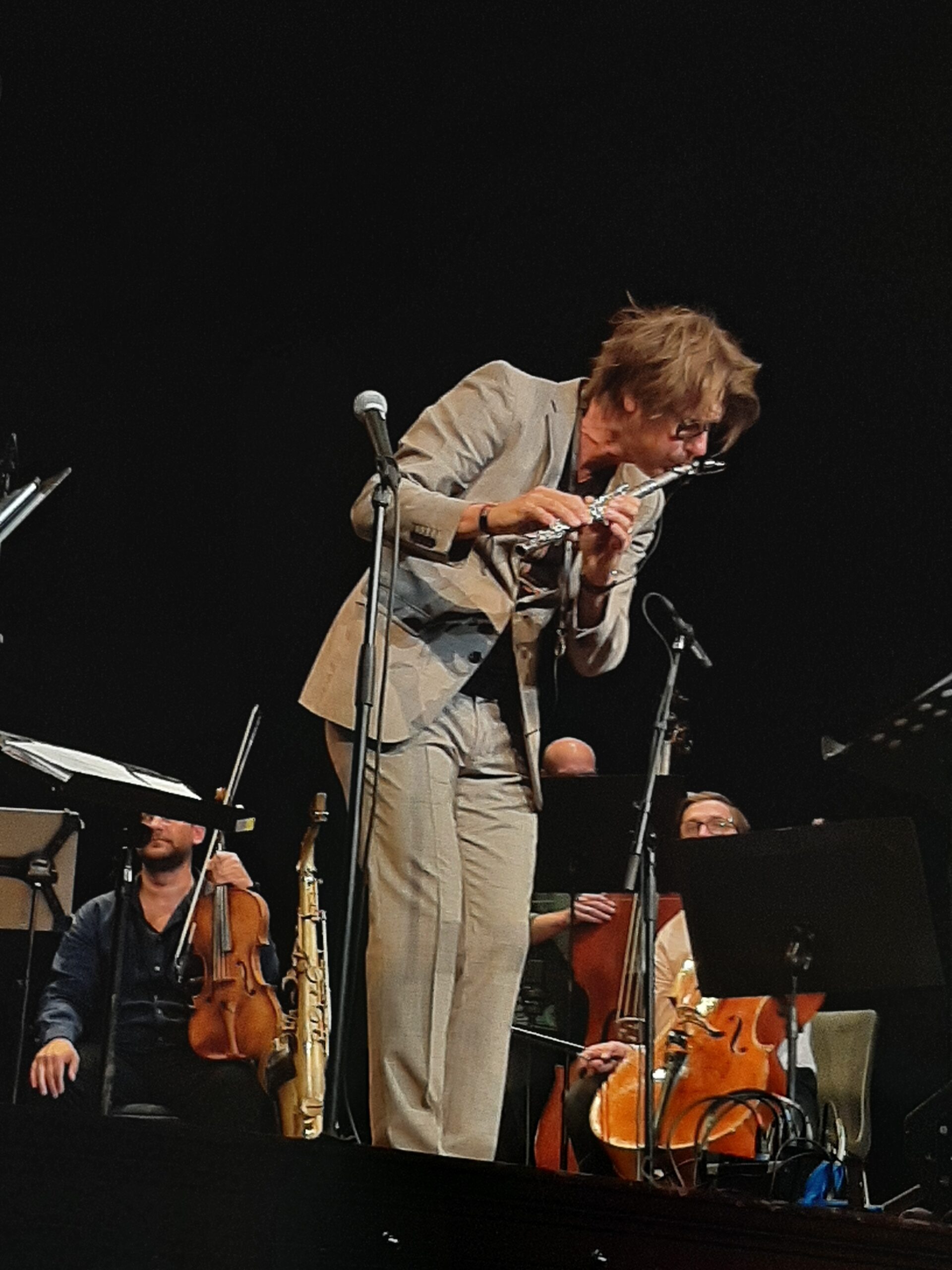 Dass nicht jedes Konzert ein Höhenflug wie diejenigen von Dave Holland und Mike Stern sein kann, versteht sich von selbst. Ein (für mich) erstaunlich kaltes Konzert – ohne nennenswerte emotionale Mitteilungskraft – gab im Nebenspielort Saltsjöbad das Duo aus dem polnischen Klavier-Überflieger Leszek Mozdzer und dem schwedischen Bassisten und Cellisten Lars Danielsson. In Stücken wie „Pasodoble“ setzten der im Sitzen spielende Bassist und der barfuß im hellgrauen Anzug erschienene Pianist hauptsächlich auf den Effekt ihrer spieltechnischen Brillanz. Einen ähnlichen Eindruck konnte man auch beim Konzert des Multiinstrumentalisten Magnus Lindgren zusammen mit dem Streicher-Ensemble Musica Vitae im Theater mitnehmen. Lindgren ist ein bewundernswerter Techniker auf der Klarinette, dem Tenorsaxophon und der Querflöte. Aber er lässt auch kaum einen Takt aus, das zu demonstrieren. In Stücken wie John Coltranes „Naima“ oder auch seiner eigenen Komposition „Stockholm Underground“ forderte er das 14-köpfige Streicher-Ensemble erstaunlich wenig: Hauptsächlich Akkordflächen durften die Musiker:innen beisteuern – als gemütliches Bett für die Soli des Blas-Instrumentalisten. Als sehr süßliches Bonbon wurde gegen Ende eine liebliche Version des Pop-Hits „A Whiter Shade of Pale“ gereicht.