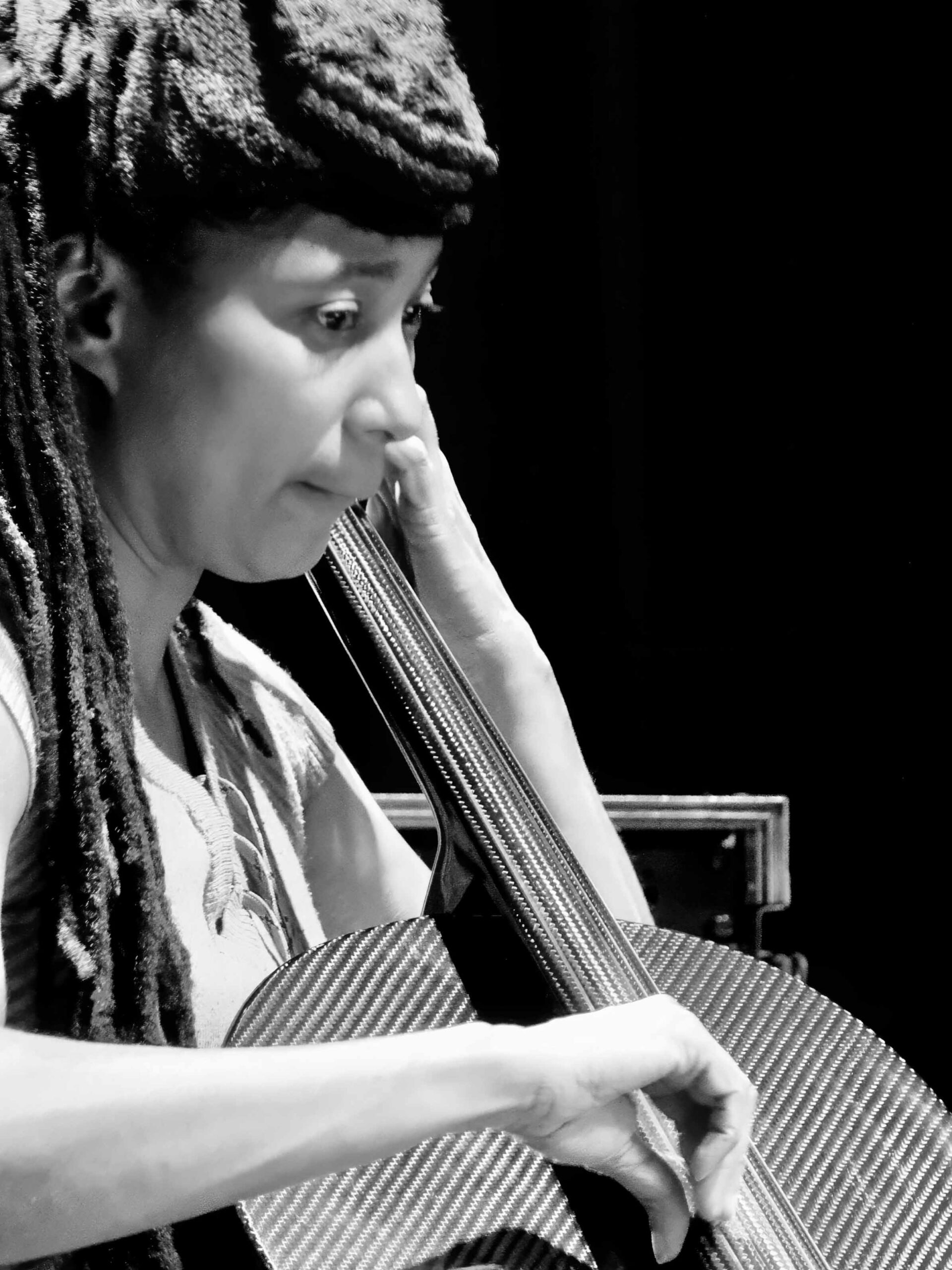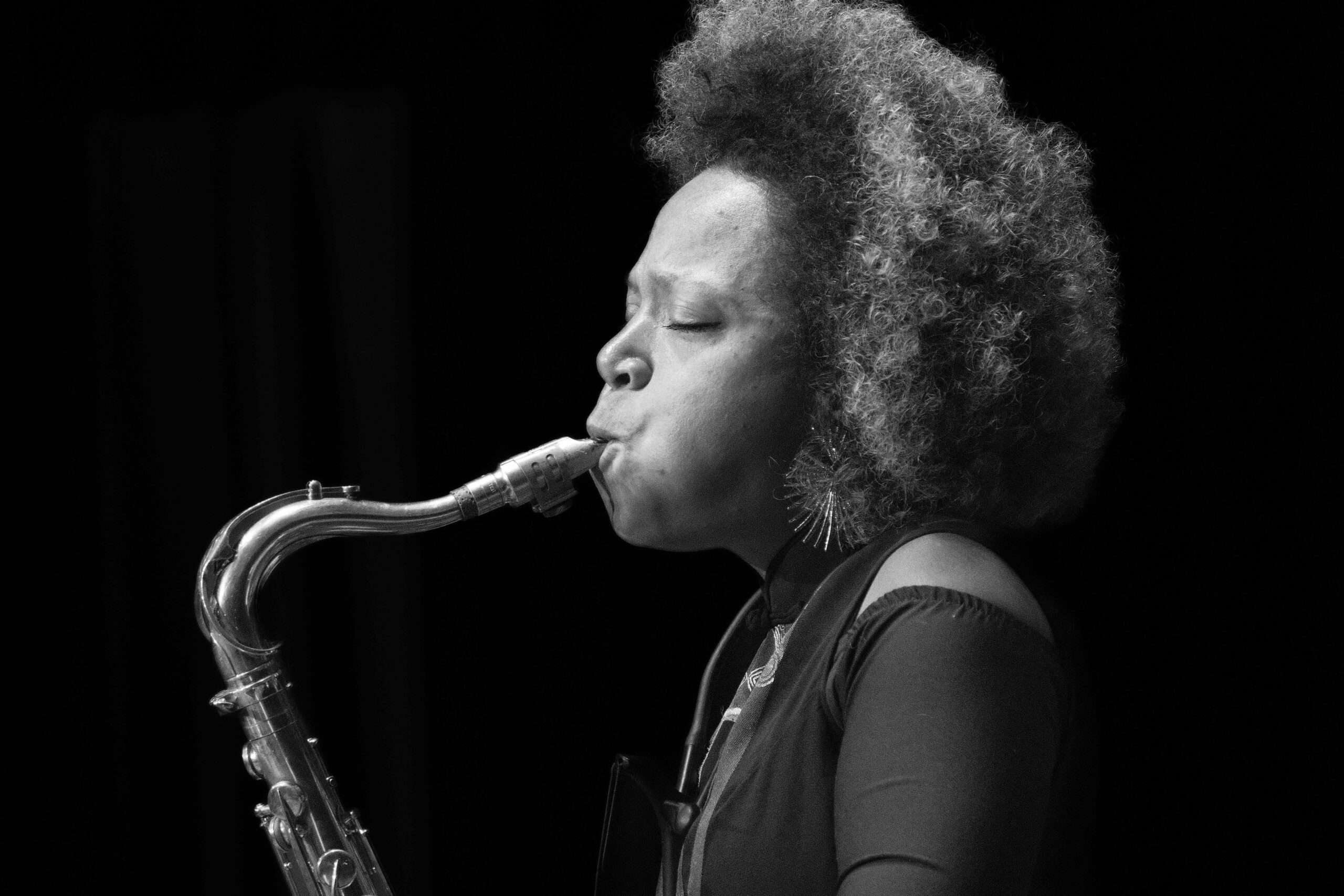 Denn gute Musik ist im Idealfall ja immer auch ein Ausdruck der Zeit, in der sie entsteht. Eindrücklich belegt wurde das zum Beispiel durch das Eröffnungskonzert am Donnerstag auf der Großen Bühne im Haus der Berliner Festspiele, bei dem die Altsaxofonistin Angelika Niescier mit der Cellistin Tomeka Reid und der Schlagzeugerin Eliza Salem ihr im Jahr 2023 erschienenes Album „Beyond Dragens“ präsentierte. In ihren Ansagen machte sie angenehm unverkrampft deutlich, wie einige der Stücke auf diesem Album gemeint sind – „Oscillating Madness“ etwa als Replik der aktuellen weltpolitischen Verhältnisse oder „Risse“ als Rückschau auf die überstandene Pandemie, die sie anfangs noch als Chance empfunden habe, mit der die Menschen zu einem neuen Miteinander finden (und vielleicht sogar den Kapitalismus überwinden) könnten … Viel mehr musste sie gar nicht mehr sagen – die atemberaubend virtuose, faszinierend ineinander verzahnte Musik ihres grandios improvisierenden Trios war auch so ein beeindruckender Ausdruck vielschichtigster Gefühlslagen.