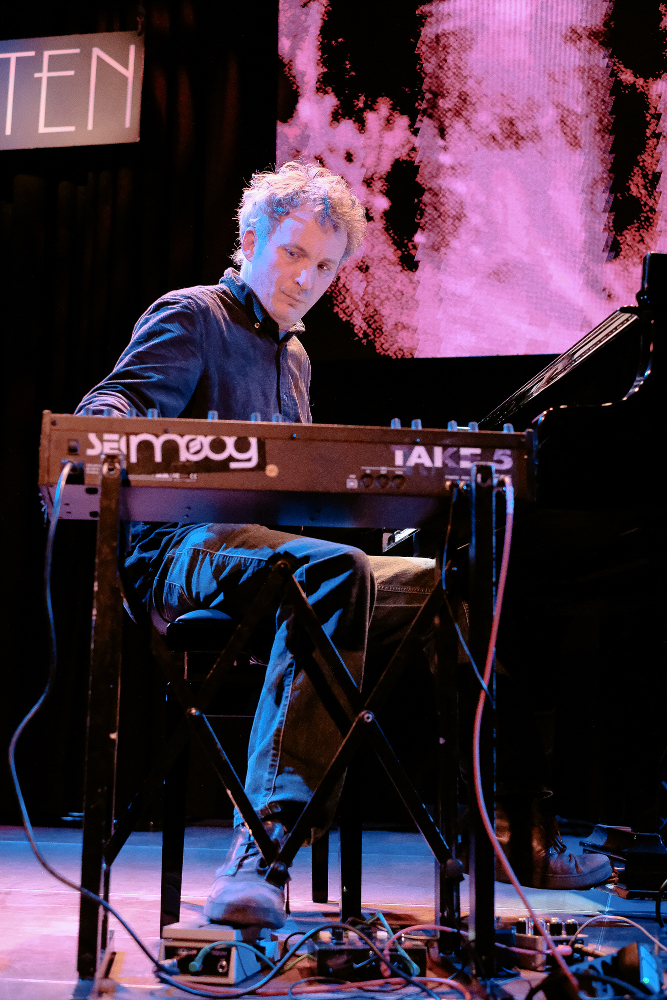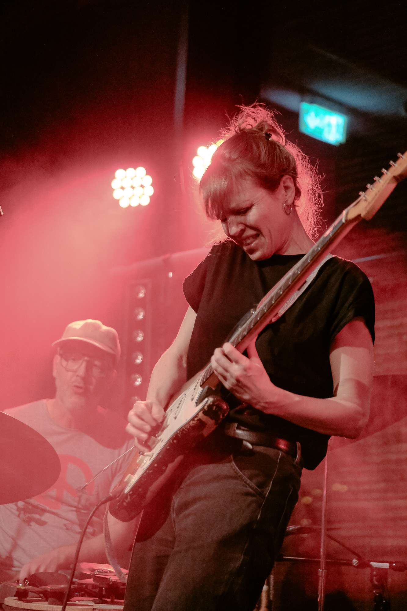 Im Club Zimmermanns ging es in den Underground hinab, vor allem mit Toxodon alias Salome Amend (Vibraphon), Raissa Mehner (Gitarre) und Schlagzeuger Simon Camatta. Wenn es zurzeit eine Band gibt, die besonders tief in ihrer Musik drin ist, dann dieses Trio, das 2023 auf der Annex-Bühne des Moers Festivals seine Geburtsstunde hatte. Amends Vibraphonspiel ist ein Befreiungsschlag, losgelöst von Jazz-Idiomatiken, dazu kommen Mehners Gitarrengewitter und Camattas elementarer Puls, der immer an den Ursprüngen ganz nah dran ist. Auch das erzeugte fesselnde Hörsituationen voll hypnotischer Energie.