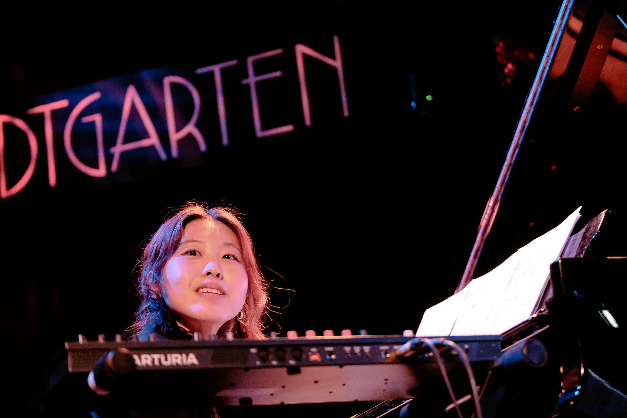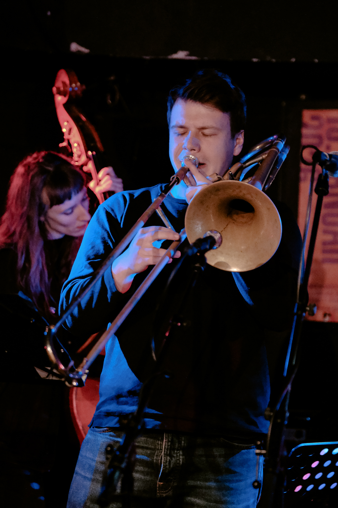Das Konzert von Tamara Lukasheva mit Kalle Kalima und Janning Trumann hatte „kriegerisch“ begonnen – um dem Wahnsinn da draußen zu begegnen, wie es Niescier in ihrer Begrüßung formuliert hatte. Rilke, philosophische Traktate über den Krieg und den Tod, Jan Wagners Text Stein und Erde – das hätte prätentiös werden können, wurde es aber nicht. Der Gestus wurde immer freudvoll-treibender, und Janning Trumanns Posaunensoli antworteten unerschöpflich auf Tamara Lukashevas Gesang und Klavierspiel. Eine improvisierte Poesie entfaltete sich, weil auch hier drei Musiker eine Konstellation bildeten, die so vorher noch nicht existiert hatte. Genau darum geht es beim Winterjazz: Niemand spielt zweimal mit derselben Besetzung.