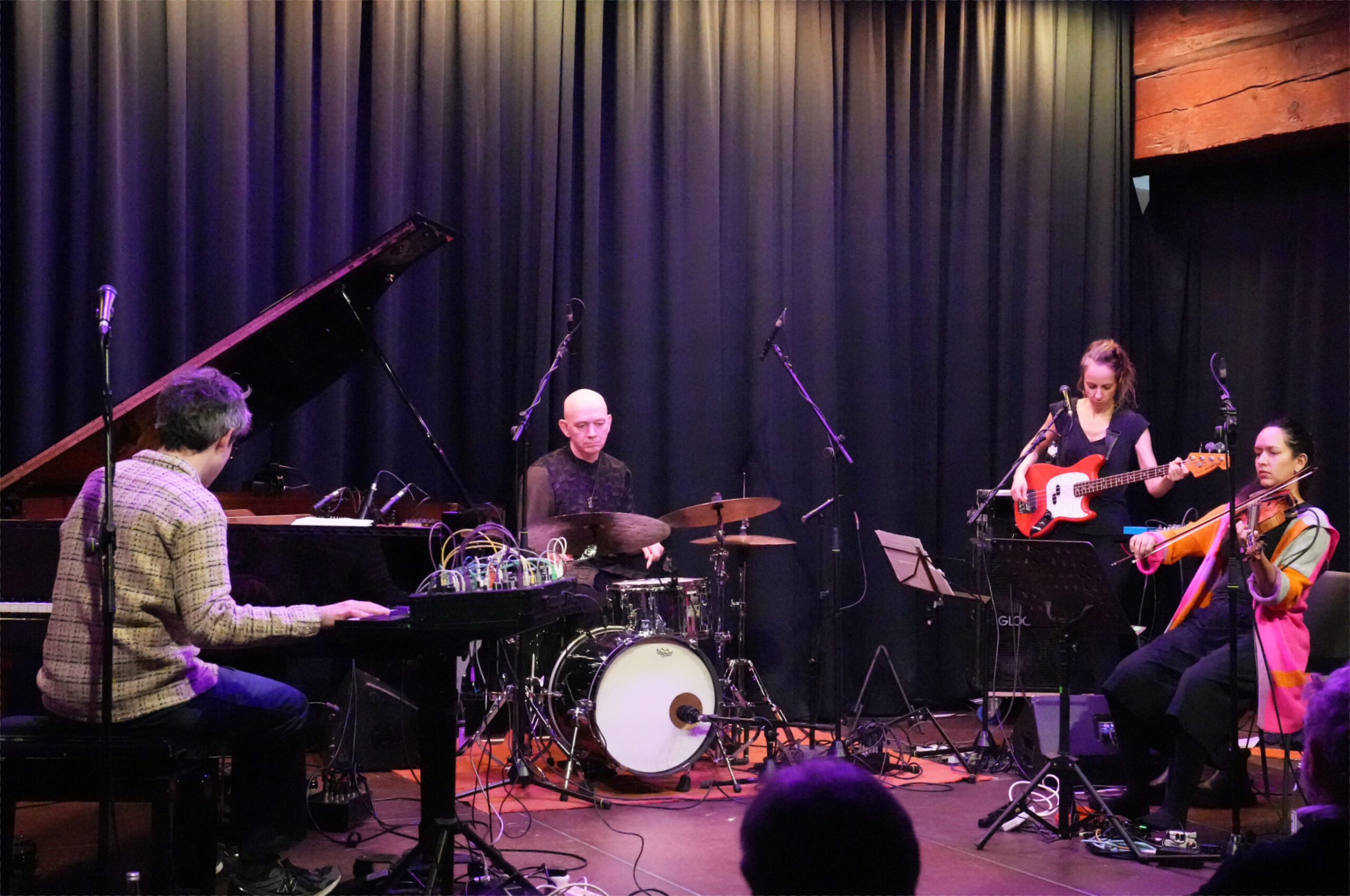 Neben dem Bass als einzigem elektrisch verstärktem Instrument, gespielt von Ruth Goller, waren Piano, Schlagzeug und eine Geige im Einsatz. Die allerdings war, wie bei vielen E-Gitarristen mit einer ganzen Latte von Effektgeräten verbunden. In einem langen frei improvisiertem Solo steuerte Mandhira de Saram diese derart virtuos mit den Füssen, dass sich über der Zuhörerschaft ein geradezu höllisches Klanggewitter entlud. Mit der brachialen Geräusch- und Lärmorgie gab die Violinistin der anfänglichen morbid-verlorenen Stimmung, die Galvin auf dem Flügel entworfen hatte, eine exzessiv bedrohliche Wendung.