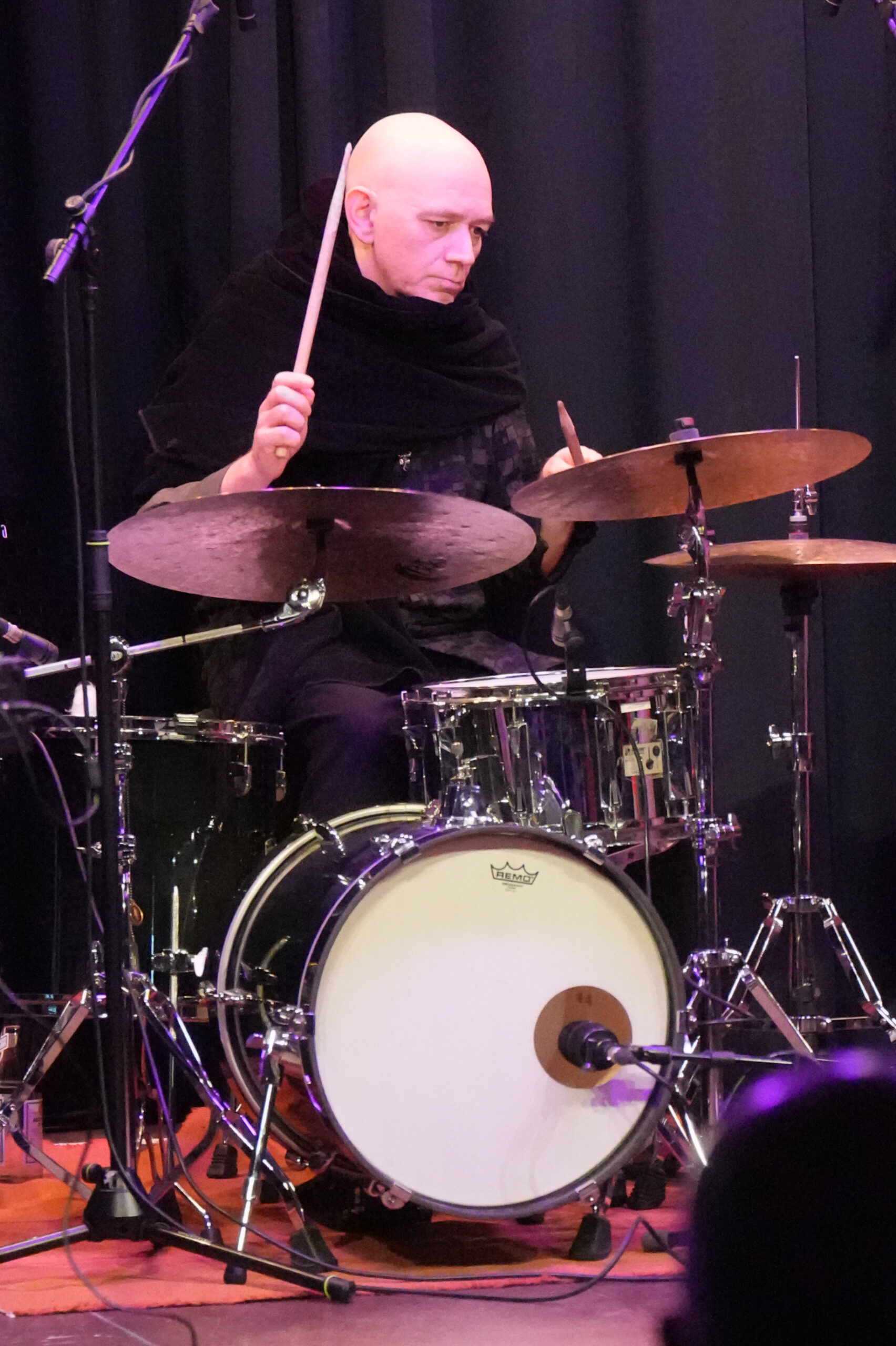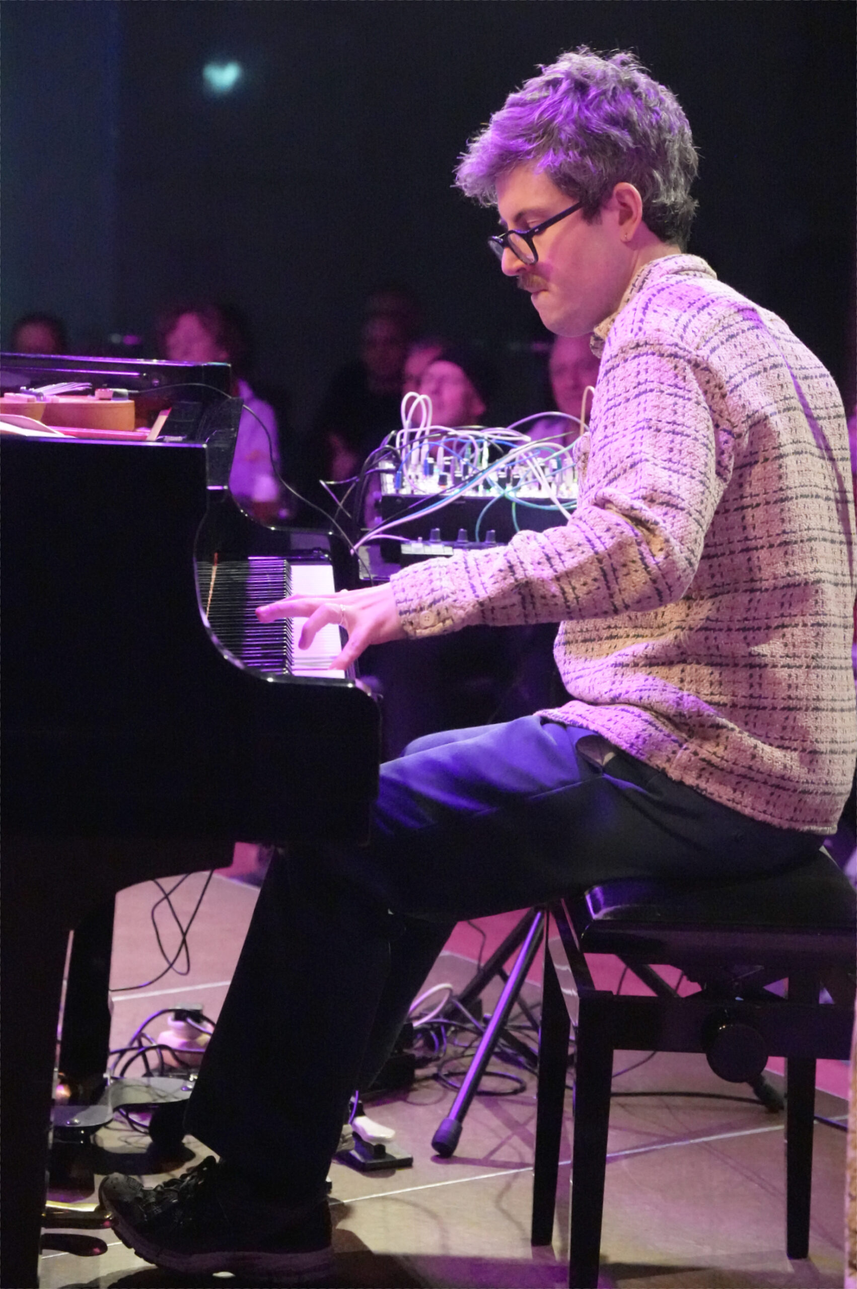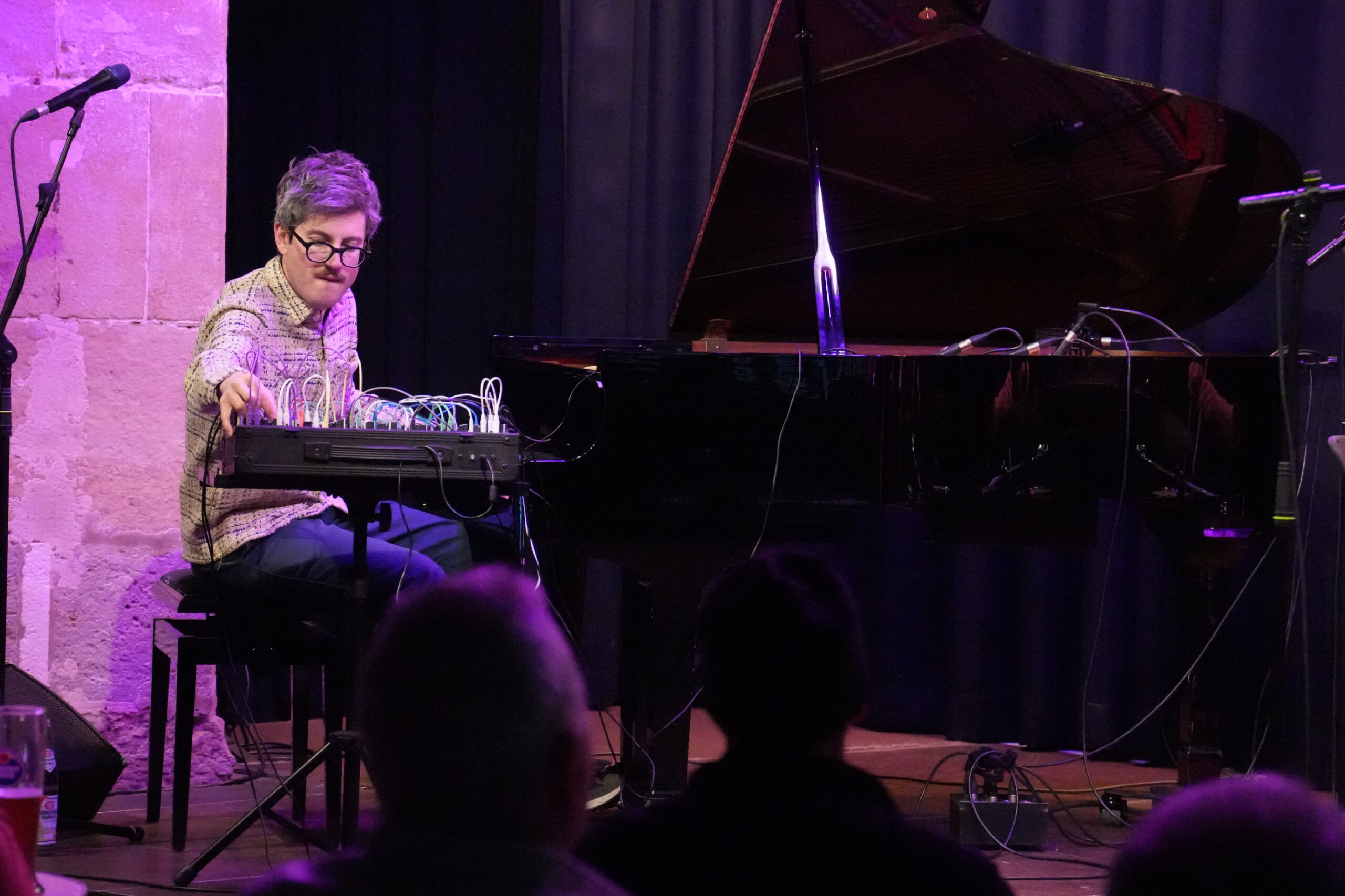 Nach dem ersten Teil, der durch eine vielfältige Landschaft aus Stimmungen, bildhaften Klanggespinsten, feinen Grooves, Disharmonien und melodischen Fragmenten führte, verließen einige offensichtlich irritierte Zuhörende den Saal im Leeren Beutel. Der große andere Teil wurde mit einem perlenden Piano-Intro wieder auf eine Fährte gelockt, die mit vokalen Lautmalereien der Bassistin schon bald eine düsterere Richtung einschlug. Elektronische Sounds, mit denen Galvin sein phänomenales Spiel am und im Flügel ergänzte, mischten sich mit dem rhythmisch freien Pattern des zurückhaltend agierenden Drummers.