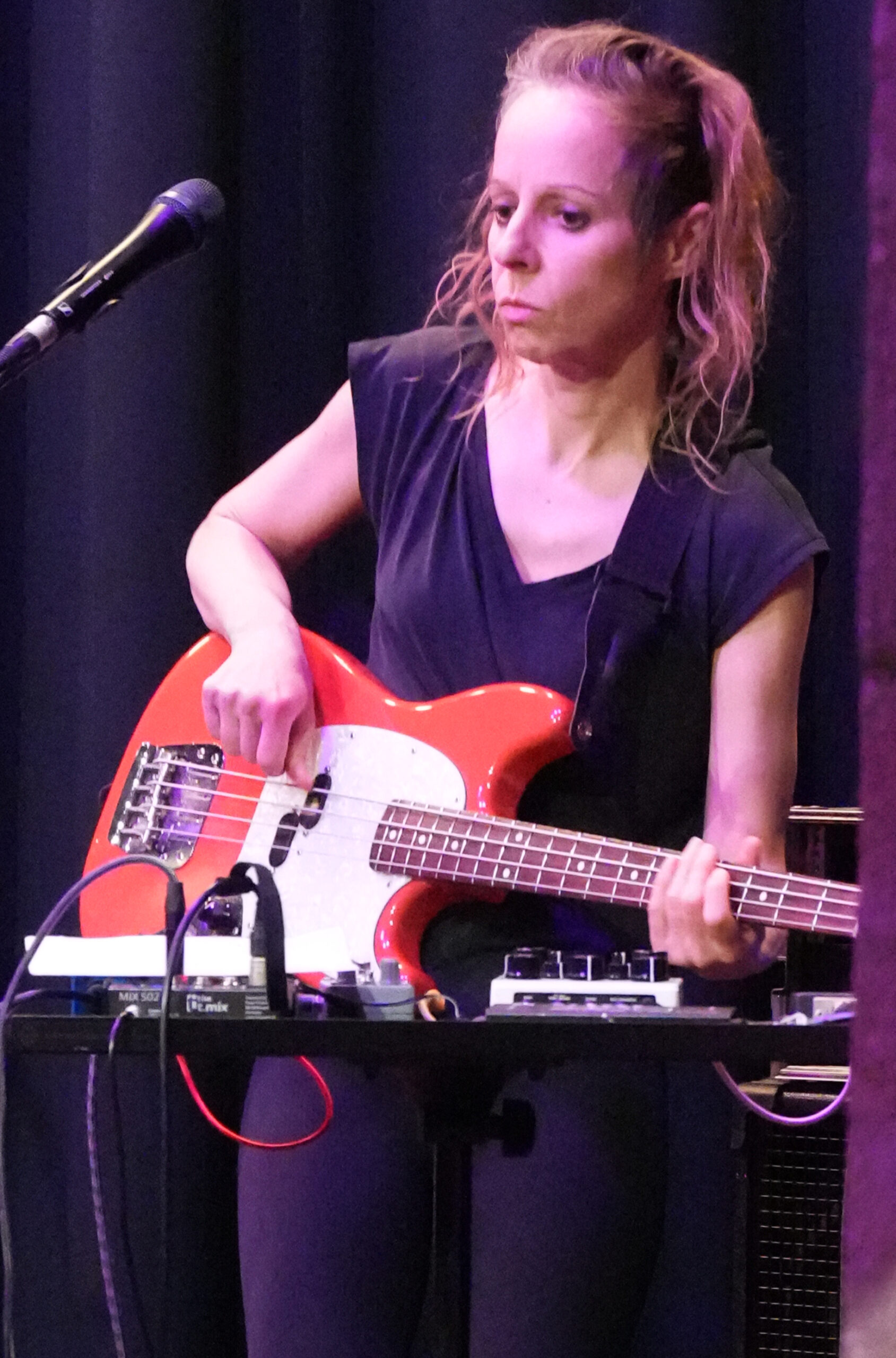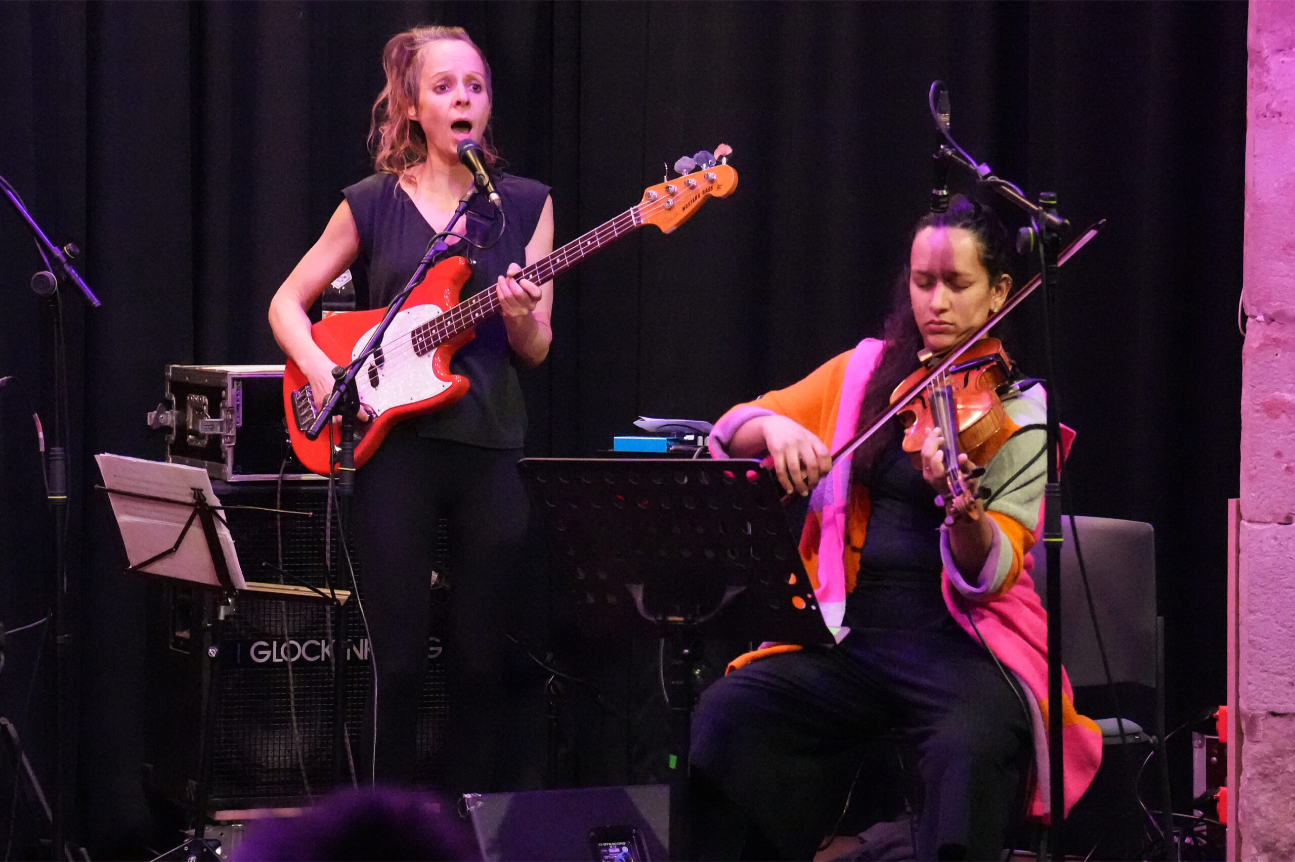 Dem stand Goller auf ihrem Fender-Bass in einer weiteren Soloimprovisation kaum etwas nach. Mit dem Plektron riss sie die Stahlsaiten ihres Instruments an, schabte und sägte auf und ab und schuf einen dynamisch harschen, pluggernd-krachenden Klangpegel des Abseitigen, als stünde man in einer nächtlichen Welt zwischen Geistern und Widergängern. Galvin, der mit einem Groove auf einem Daumenklavier eine andere Richtung einschlug, und Drummer Sebastian Rochford führten das Stück aus dem Album „The Ruin“ wieder in ruhigere Gefilde.
