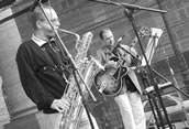 So informativ Dennis Schütze durch sein Programm führte, so wortkarg gab sich Walter Lang mit seinem neuen Format „Tr!o 11“, in das als umherwandelnder Quereinsteiger sich hineinzufinden nicht leicht fiel. Lückenlos reihten sich die Nummern aneinander, von Gerwin Eisenhauer mit der faszinierenden Unerbittlichkeit eines Drumcomputers zusammengehalten. Langs Klavierspiel legte sich melodieselig darüber, begann leuchtend zu oszillieren, sammelte sich im Kreisen um eine harmonische Wendung zu neuen Energienentladungen. Ebenfalls fest in die Münchner Jazzszene integriert, ist der Saxophonist Alessandro De Santis, ein „kleiner Italiener“, wie er sich selbst augenzwinkernd charakterisiert, der mit den italienischen Canzoni seiner aktuellen CD „Roma Termini“ ein Stück Heimweh besingt. Da können die übrigen Musiker und natürlich auch wir alle unsere Sehnsucht nach dem Süden ausleben: schwelgen in den wunderbaren Melodien eines Paolo Fresu („Fellini“), Aldo Romano („Tempo“) oder Lucio Dalla („Caruso“), im Geiste mitsingen bei Paolo Contes unsterblichem Schlager „Azzurro“, hier in einer überraschend stimmigen Funkversion. Und einer sitzt auf seiner Klavierbank zwischen den Stühlen des Fern- oder Heimwehs und steuert bei seinem Weekend-Debüt (!) die subtilsten Soli und eine wunderbare Hommage an seinen Mailänder Großvater bei: Joe Kienemann. Und doch scheint Graz und nicht die Heimatstadt Walter Langs, Alessandro De Santis‘ oder Joe Kienemanns derzeit die Jazzmetropole im südlichen deutschsprachigen Raum zu sein. Was die beiden Nachwuchsformationen da auf die Beine stellten, war schon ein Jazzweekend wert. Und deckte dabei zwei völlig verschiedene musikalische Spektren ab. „Jujuphonics“ pflegen einen modernen, eigenständigen Jazz mit Kompositionen, die zwischen dichter Funktionsharmonik und sparsamen, der Improvisation viel Freiraum gewährenden modalen Ebenen changieren. Die Formation „Beefòlk“ zelebriert dagegen eine folkloristische Offenheit, die als Spagat zwischen Balkanriffs, Tango nuevo, indisch inspirierten Flötenklängen und isländischen Vokalisen naturgemäß nicht ohne eine ordentliche Portion Eklektizismus abgeht. Sie sei dem jugendlichen Überschwang ebenso verziehen wie manch pathetisch aufgeladene, von Hall- und Echowolken umflorte Steigerung? Wer so um sein Leben spielt wie Klemens Bittmann an der Geige, Christian Bakanic am Akkordeon oder Georg Grazer am Sopransax und sich so rückhaltlos der vokalen Extase hingibt wie Helgi Hfran Jonsson, hat alle Ovationen verdient (aktuelle CD „Place dramatique erschienen bei Material Records). Eine weitere Band setzte bei diesem kleinen östereichischen Festival im Weekend vor allem handwerklich Akzente. Was Roman Janoska, der 14-jährige (!) Geiger des „New Generation“-Preisträgers „No Limit“, nicht nur in Sachen technischer Versiertheit und sattem Schmelz in bester k. u. k.-Tradition, sondern vor allem auch in der Prägnanz der Bebop-Phrasen zu bieten hatte, war schon atemberaubend. Der ein oder andere Überraschungsmoment im Arrangement hätte ihm und seinem ebenfalls exzellenten Bruder Franz am Piano allerdings gut getan. Weitere Streifzüge endeten, trotz guter Vorsätze, dann doch wieder einmal bei alten Bekannten. Zum Beispiel bei Gerhard Kraus, diesem außerordentlichen Gitarristen, der sich mit hochklassigen Soli und hörenswerten Eigenkompositionen bestens in die Formation rund um den Nürnberger Saxophonisten Norbert Eisner einfügte. Oder einmal mehr bei Walter Bittner, der mit „Double You-be“ vormachte, was es heißen kann, auf der Basis Latin-beeinflusster Jazz- und Rockgrooves anspruchsvolle Musik zu machen, die Herz und Hirn gleichermaßen anspricht, die Spaß macht, ohne sich plump anzubiedern, die herausfordert, ohne sich im Abstrakten zu verheddern. Bis auf gelegentliche Klaviergrundierung durch Helmut Troendle spielen sich die herausragenden Eigenkompositionen auf einem dicht pulsierenden Gewebe aus perkussiven Elementen und der herausragenden Bassarbeit Klaus Fügers ab. Die melodischen Linien, sei es vokal durch Ute Legner und Schlagzeuger Bittner selbst oder instrumental durch Bobby Palleis an den Saxophonen, behalten Raum zur Entfaltung, zur Improvisation, bleiben offen für Assoziationen in verschiedenste musikalische Richtungen. So muss Jazz sein.